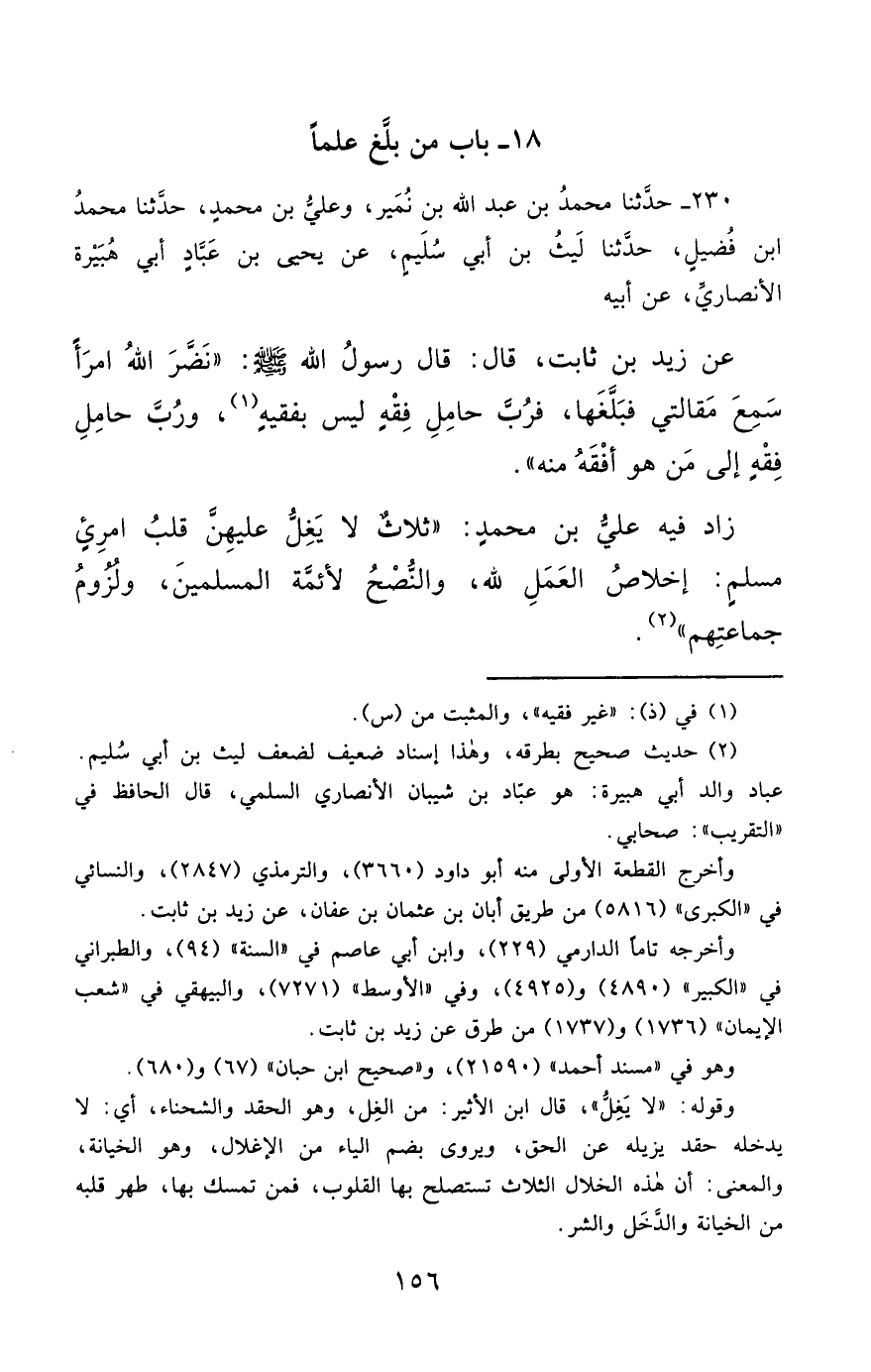 230- حَدَّثَنَا مُحَمَّدُ بْنُ عَبْدِ اللهِ بْنِ نُمَيْرٍ ، وَعَلِيُّ بْنُ مُحَمَّدٍ ، حَدَّثَنَا مُحَمَّدُ بْنُ فُضَيْلٍ ، حَدَّثَنَا لَيْثُ بْنُ أَبِي سُلَيْمٍ ، عَنْ يَحْيَى بْنِ عَبَّادٍ أَبِي هُبَيْرَةَ الأَنْصَارِيِّ ، عَنْ أَبِيهِ ، عَنْ زَيْدِ بْنِ ثَابِتٍ ، قَالَ : قَالَ رَسُولُ اللهِ صَلَّى الله عَليْهِ وسَلَّمَ : نَضَّرَ اللَّهُ امْرَءًا سَمِعَ مَقَالَتِي فَبَلَّغَهَا ، فَرُبَّ حَامِلِ فِقْهٍ لَيْسَ بِفَقِيهٍ ، وَرُبَّ حَامِلِ فِقْهٍ إِلَى مَنْ هُوَ أَفْقَهُ مِنْهُ.