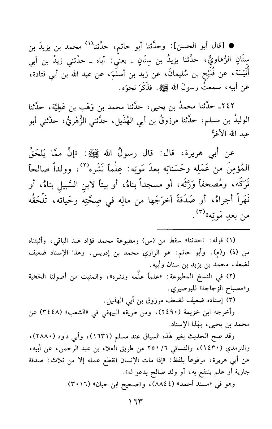 242- حَدَّثَنَا مُحَمَّدُ بْنُ يَحْيَى ، حَدَّثَنَا مُحَمَّدُ بْنُ وَهْبِ بْنِ عَطِيَّةَ ، حَدَّثَنَا الْوَلِيدُ بْنُ مُسْلِمٍ ، حَدَّثَنَا مَرْزُوقُ بْنُ أَبِي الْهُذَيْلِ , حَدَّثَنِي الزُّهْرِيُّ , حَدَّثَنِي أَبُو عَبْدِ اللهِ الأَغَرُّ ، عَنْ أَبِي هُرَيْرَةَ ، قَالَ : قَالَ رَسُولُ اللهِ صَلَّى الله عَليْهِ وسَلَّمَ : إِنَّ مِمَّا يَلْحَقُ الْمُؤْمِنَ مِنْ عَمَلِهِ وَحَسَنَاتِهِ بَعْدَ مَوْتِهِ : عِلْمًا نَشَرَهُ ، وَوَلَدًا صَالِحًا تَرَكَهُ ، وَمُصْحَفًا وَرَّثَهُ ، أَوْ مَسْجِدًا بَنَاهُ ، أَوْ بَيْتًا لاِبْنِ السَّبِيلِ بَنَاهُ ، أَوْ نَهْرًا أَجْرَاهُ ، أَوْ صَدَقَةً أَخْرَجَهَا مِنْ مَالِهِ فِي صِحَّتِهِ وَحَيَاتِهِ ، تَلْحَقُهُ مِنْ بَعْدِ مَوْتِهِ.
