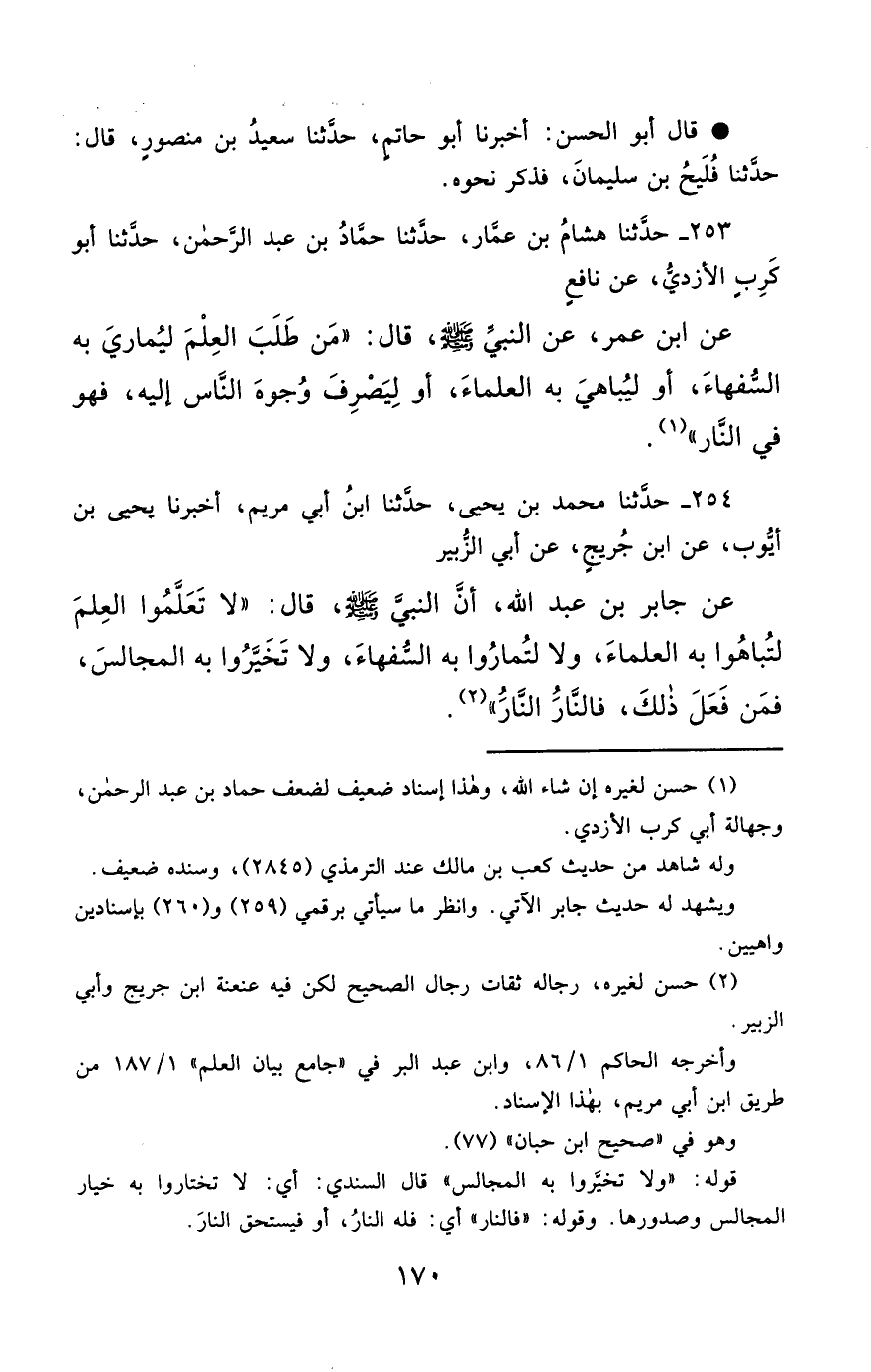 254- حَدَّثَنَا مُحَمَّدُ بْنُ يَحْيَى ، حَدَّثَنَا ابْنُ أَبِي مَرْيَمَ ، أَخْبَرَنَا يَحْيَى بْنُ أَيُّوبَ ، عَنِ ابْنِ جُرَيْجٍ ، عَنْ أَبِي الزُّبَيْرِ ، عَنْ جَابِرِ بْنِ عَبْدِ اللهِ ، أَنَّ النَّبِيَّ صَلَّى الله عَليْهِ وسَلَّمَ قَالَ : لاَ تَعَلَّمُوا الْعِلْمَ لِتُبَاهُوا بِهِ الْعُلَمَاءَ ، وَلاَ لِتُمَارُوا بِهِ السُّفَهَاءَ ، وَلاَ تَخَيَّرُوا بِهِ الْمَجَالِسَ ، فَمَنْ فَعَلَ ذَلِكَ فَالنَّارُ النَّارُ.
