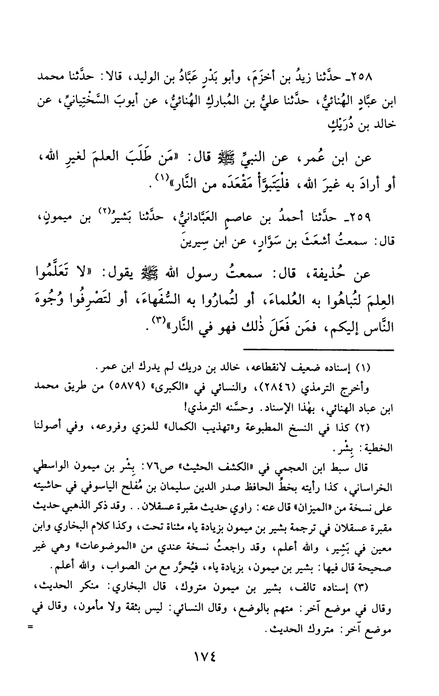 259- حَدَّثَنَا أَحْمَدُ بْنُ عَاصِمٍ الْعَبَّادَانِيُّ ، حَدَّثَنَا بَشِيرُ بْنُ مَيْمُونٍ ، قَالَ : سَمِعْتُ أَشْعَثَ بْنَ سَوَّارٍ ، عَنِ ابْنِ سِيرِينَ ، عَنْ حُذَيْفَةَ ، قَالَ : سَمِعْتُ رَسُولَ اللهِ صَلَّى الله عَليْهِ وسَلَّمَ يَقُولُ : لاَ تَعَلَّمُوا الْعِلْمَ لِتُبَاهُوا بِهِ الْعُلَمَاءَ ، أَوْ لِتُمَارُوا بِهِ السُّفَهَاءَ ، أَوْ لِتَصْرِفُوا وُجُوهَ النَّاسِ إِلَيْكُمْ ، فَمَنْ فَعَلَ ذَلِكَ فَهُوَ فِي النَّارِ.