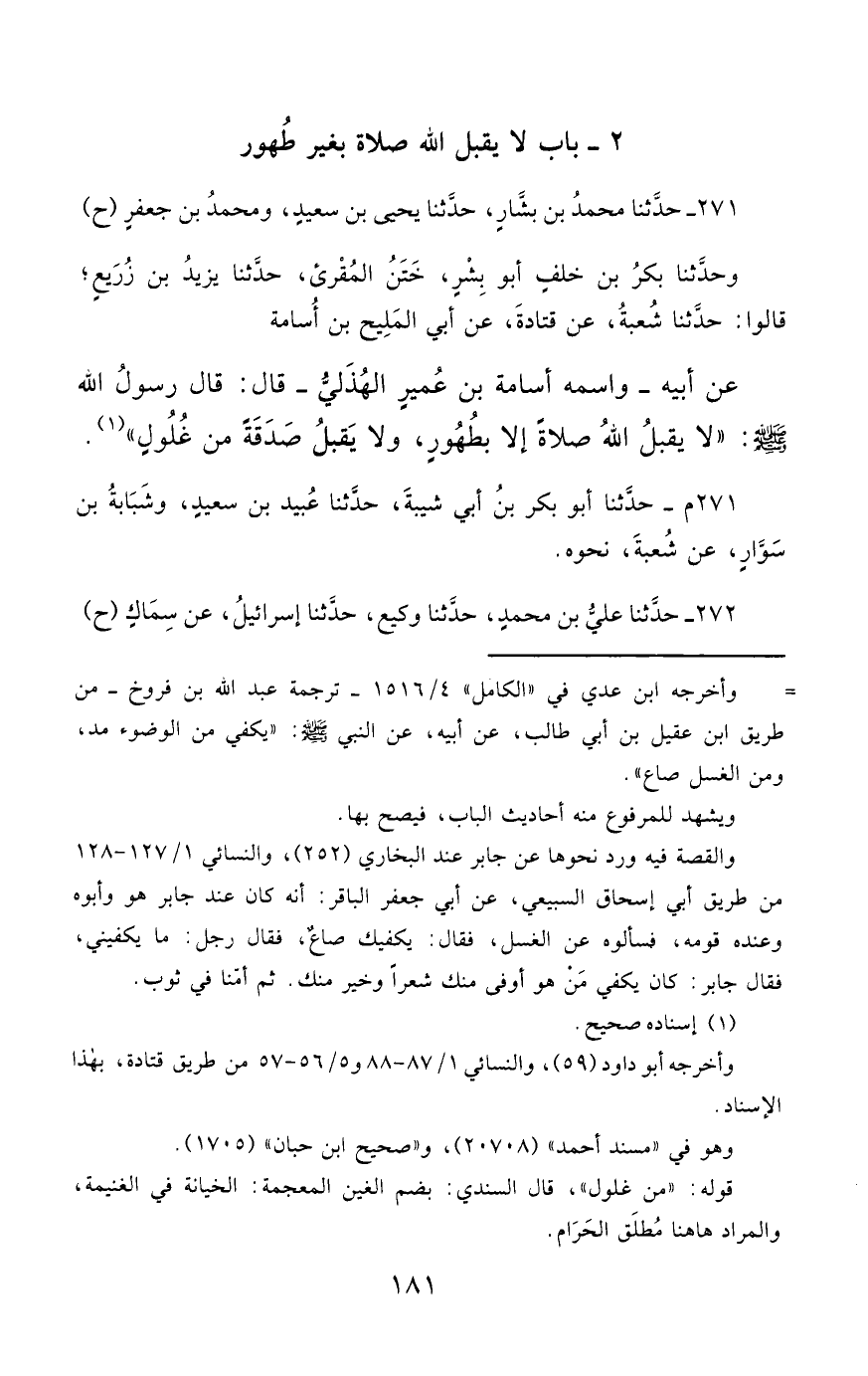 271- حَدَّثَنَا مُحَمَّدُ بْنُ بَشَّارٍ ، حَدَّثَنَا يَحْيَى بْنُ سَعِيدٍ ، وَمُحَمَّدُ بْنُ جَعْفَرٍ (ح) وَحَدَّثَنَا بَكْرُ بْنُ خَلَفٍ أَبُو بِشْرٍ خَتَنُ الْمُقْرِئِ ، حَدَّثَنَا يَزِيدُ بْنُ زُرَيْعٍ , قَالُوا : حَدَّثَنَا شُعْبَةُ ، عَنْ قَتَادَةَ ، عَنْ أَبِي الْمَلِيحِ بْنِ أُسَامَةَ ، عَنْ أَبِيهِ , واسْمُهُ : أُسَامَةُ بْنُ عُمَيْرٍ الْهُذَلِيُّ ، قَالَ : قَالَ رَسُولُ اللهِ صَلَّى الله عَليْهِ وسَلَّمَ : لاَ يَقْبَلُ اللَّهُ صَلاَةً إِلاَّ بِطُهُورٍ ، وَلاَ يَقْبَلُ صَدَقَةً مِنْ غُلُولٍ.