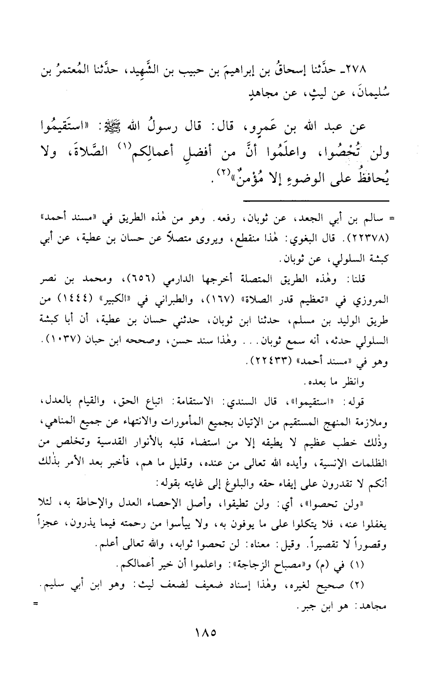 278- حَدَّثَنَا إِسْحَاقُ بْنُ إِبْرَاهِيمَ بْنِ حَبِيبِ بْنِ الشَّهيدِ ، حَدَّثَنَا الْمُعْتَمِرُ بْنُ سُلَيْمَانَ ، عَنْ لَيْثٍ ، عَنْ مُجَاهِدٍ ، عَنْ عَبْدِ اللهِ بْنِ عَمْرٍو ، قَالَ : قَالَ رَسُولُ اللهِ صَلَّى الله عَليْهِ وسَلَّمَ : اسْتَقِيمُوا ، وَلَنْ تُحْصُوا ، وَاعْلَمُوا أَنَّ مِنْ أَفْضَلِ أَعْمَالِكُمُ الصَّلاَةَ ، وَلاَ يُحَافِظُ عَلَى الْوُضُوءِ إِلاَّ مُؤْمِنٌ.