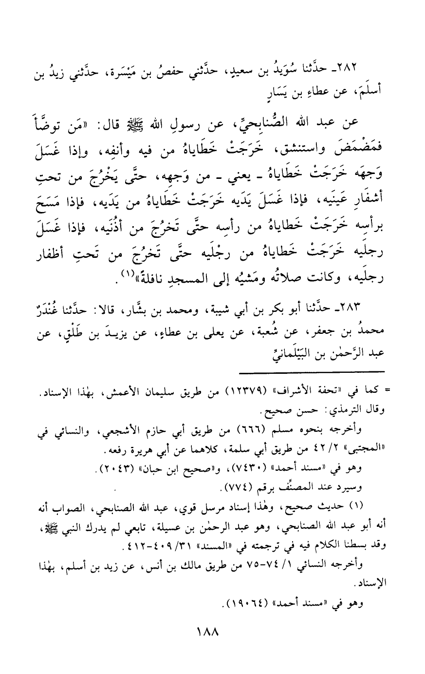 282- حَدَّثَنَا سُوَيْدُ بْنُ سَعِيدٍ , حَدَّثَنِي حَفْصُ بْنُ مَيْسَرَةَ , حَدَّثَنِي زَيْدُ بْنُ أَسْلَمَ ، عَنْ عَطَاءِ بْنِ يَسَارٍ ، عَنْ عَبْدِ اللهِ الصُّنَابِحِيّ ، عَنْ رَسُولِ اللهِ صَلَّى الله عَليْهِ وسَلَّمَ قَالَ : مَنْ تَوَضَّأَ , فَمَضْمَضَ وَاسْتَنْشَقَ ، خَرَجَتْ خَطَايَاهُ مِنْ فِيهِ وَأَنْفِهِ ، وَإِذَا غَسَلَ وَجْهَهُ , خَرَجَتْ خَطَايَاهُ , يَعْنِي مِنْ وَجْهِهِ ، حَتَّى يَخْرُجَ مِنْ تَحْتِ أَشْفَارِ عَيْنَيْهِ ، فَإِذَا غَسَلَ يَدَيْهِ , خَرَجَتْ خَطَايَاهُ مِنْ يَدَيْهِ ، فَإِذَا مَسَحَ بِرَأْسِهِ , خَرَجَتْ خَطَايَاهُ مِنْ رَأْسِهِ ، حَتَّى تَخْرُجَ مِنْ أُذُنَيْهِ ، فَإِذَا غَسَلَ رِجْلَيْهِ , خَرَجَتْ خَطَايَاهُ مِنْ رِجْلَيْهِ ، حَتَّى تَخْرُجَ مِنْ تَحْتِ أَظْفَارِ رِجْلَيْهِ ، وَكَانَتْ صَلاَتُهُ وَمَشْيُهُ إِلَى الْمَسْجِدِ نَافِلَةً.