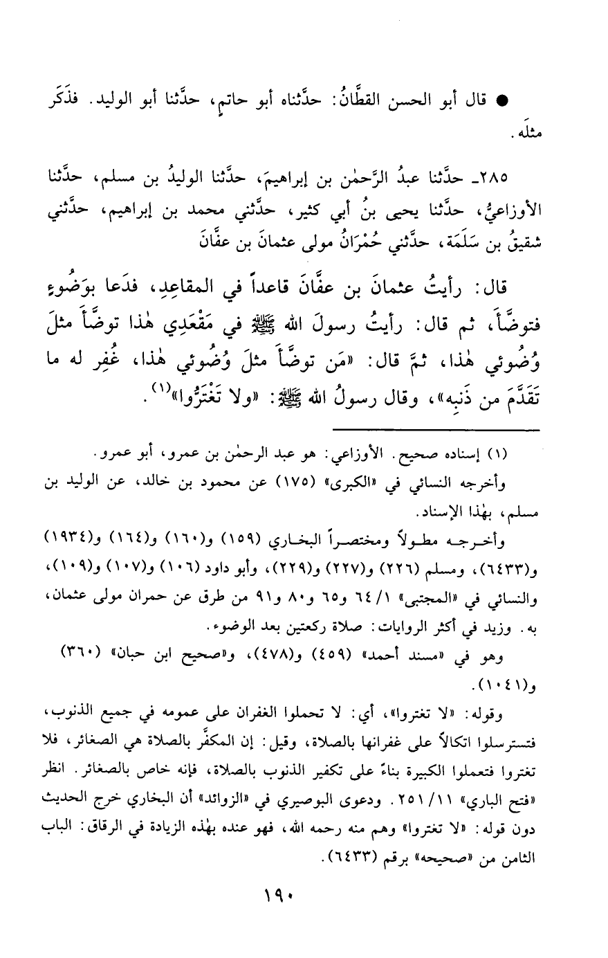 285- حَدَّثَنَا عَبْدُ الرَّحْمَنِ بْنُ إِبْرَاهِيمَ ، حَدَّثَنَا الْوَلِيدُ بْنُ مُسْلِمٍ ، حَدَّثَنَا الأَوْزَاعِيُّ ، حَدَّثَنَا يَحْيَى بْنُ أَبِي كَثِيرٍ , حَدَّثَنِي مُحَمَّدُ بْنُ إِبْرَاهِيمَ , حَدَّثَنِي شَقِيقُ بْنُ سَلَمَةَ , حَدَّثَنِي حُمْرَانُ ، مَوْلَى عُثْمَانَ بْنِ عَفَّانَ ، قَالَ : رَأَيْتُ عُثْمَانَ بْنَ عَفَّانَ قَاعِدًا فِي الْمَقَاعِدِ ، فَدَعَا بِوَضُوءٍ فَتَوَضَّأَ ، ثُمَّ قَالَ : رَأَيْتُ رَسُولَ اللهِ صَلَّى الله عَليْهِ وسَلَّمَ فِي مَقْعَدِي هَذَا ، تَوَضَّأَ مِثْلَ وُضُوئِي هَذَا ، ثُمَّ قَالَ : مَنْ تَوَضَّأَ مِثْلَ وُضُوئِي هَذَا ، غُفِرَ لَهُ مَا تَقَدَّمَ مِنْ ذَنْبِهِ , وَقَالَ رَسُولُ اللهِ صَلَّى الله عَليْهِ وسَلَّمَ : وَلاَ تَغْتَرُّوا.
