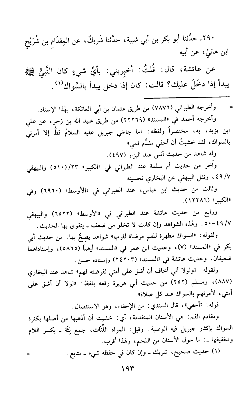 290- حَدَّثَنَا أَبُو بَكْرِ بْنُ أَبِي شَيْبَةَ ، حَدَّثَنَا شَرِيكٌ ، عَنِ الْمِقْدَامِ بْنِ شُرَيْحِ بْنِ هَانِئٍ ، عَنْ أَبِيهِ ، عَنْ عَائِشَةَ ، قَالَ : قُلْتُ : أَخْبِرِينِي بِأَيِّ شَيْءٍ كَانَ النَّبِيُّ صَلَّى الله عَليْهِ وسَلَّمَ يَبْدَأُ إِذَا دَخَلَ عَلَيْكِ ؟ قَالَتْ : كَانَ إِذَا دَخَلَ يَبْدَأُ بِالسِّوَاكِ.
