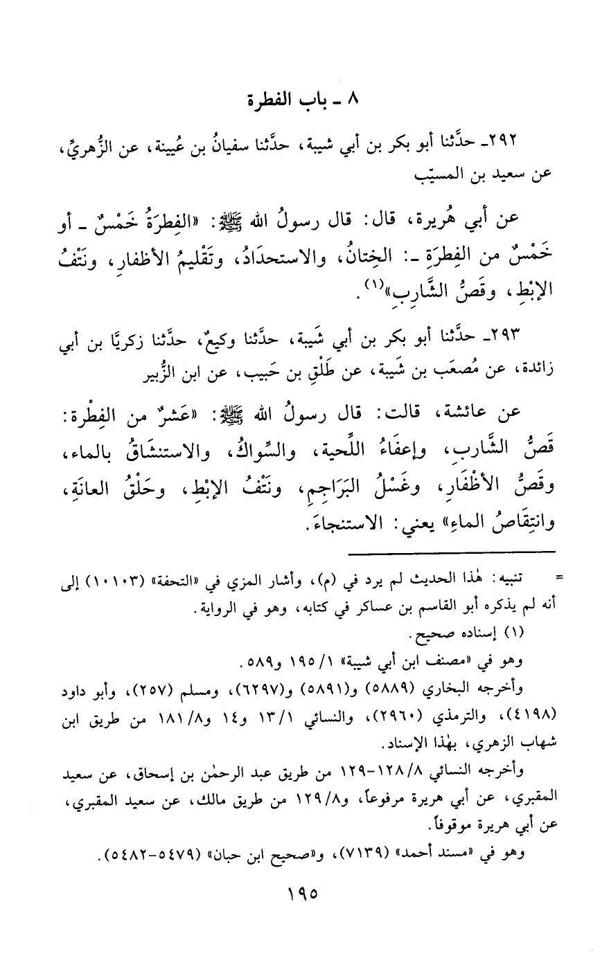 292- حَدَّثَنَا أَبُو بَكْرِ بْنُ أَبِي شَيْبَةَ ، حَدَّثَنَا سُفْيَانُ بْنُ عُيَيْنَةَ ، عَنِ الزُّهْرِيِّ ، عَنْ سَعِيدِ بْنِ الْمُسَيَّبِ ، عَنْ أَبِي هُرَيْرَةَ ، قَالَ : قَالَ رَسُولُ اللهِ صَلَّى الله عَليْهِ وسَلَّمَ : الْفِطْرَةُ خَمْسٌ ، أَوْ خَمْسٌ مِنَ الْفِطْرَةِ : الْخِتَانُ ، وَالاِسْتِحْدَادُ ، وَتَقْلِيمُ الأَظْفَارِ ، وَنَتْفُ الإِبْطِ ، وَقَصُّ الشَّارِبِ.