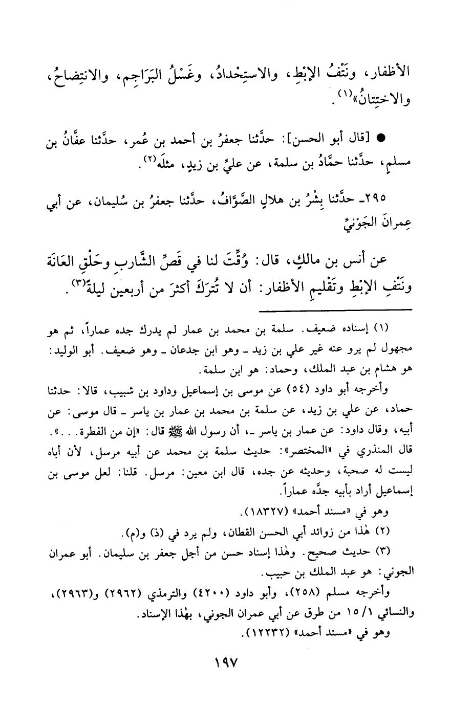 295- حَدَّثَنَا بِشْرُ بْنُ هِلاَلٍ الصَّوَّافُ ، حَدَّثَنَا جَعْفَرُ بْنُ سُلَيْمَانَ ، عَنْ أَبِي عِمْرَانَ الْجَوْنِيِّ ، عَنْ أَنَسِ بْنِ مَالِكٍ ، قَالَ : وُقِّتَ لَنَا فِي قَصِّ الشَّارِبِ ، وَحَلْقِ الْعَانَةِ ، وَنَتْفِ الإِبْطِ ، وَتَقْلِيمِ الأَظْفَارِ ، أَنْ لاَ تُتْرَكَ أَكْثَرَ مِنْ أَرْبَعِينَ لَيْلَةً.