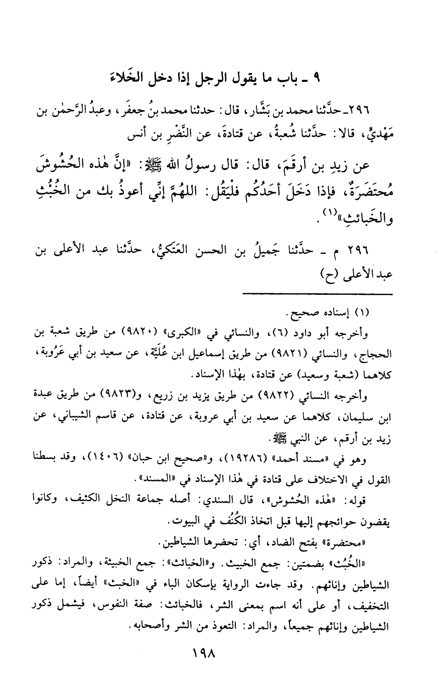 296- حَدَّثَنَا مُحَمَّدُ بْنُ بَشَّارٍ ، قَالَ : حَدَّثَنَا مُحَمَّدُ بْنُ جَعْفَرٍ ، وَعَبْدُ الرَّحْمَنِ بْنُ مَهْدِيٍّ ، قَالاَ : حَدَّثَنَا شُعْبَةُ ، عَنْ قَتَادَةَ ، عَنِ النَّضْرِ بْنِ أَنَسٍ ، عَنْ زَيْدِ بْنِ أَرْقَمَ ، قَالَ : قَالَ رَسُولُ اللهِ صَلَّى الله عَليْهِ وسَلَّمَ : إِنَّ هَذِهِ الْحُشُوشَ مُحْتَضَرَةٌ ، فَإِذَا دَخَلَ أَحَدُكُمْ ، فَلْيَقُلِ : اللَّهُمَّ إِنِّي أَعُوذُ بِكَ مِنَ الْخُبُثِ وَالْخَبَائِثِ.