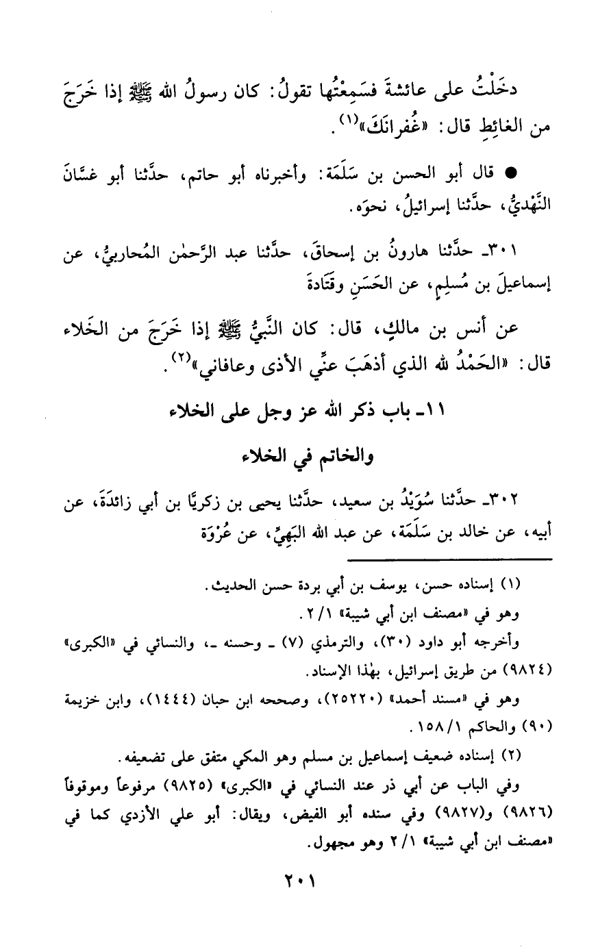 301- حَدَّثَنَا هَارُونُ بْنُ إِسْحَاقَ ، حَدَّثَنَا عَبْدُ الرَّحْمَنِ الْمُحَارِبِيُّ ، عَنْ إِسْمَاعِيلَ بْنِ مُسْلِمٍ ، عَنِ الْحَسَنِ ، وَقَتَادَةَ ، عَنْ أَنَسِ بْنِ مَالِكٍ ، قَالَ : كَانَ النَّبِيُّ صَلَّى الله عَليْهِ وسَلَّمَ إِذَا خَرَجَ مِنَ الْخَلاَءِ ، قَالَ : الْحَمْدُ لِلَّهِ الَّذِي أَذْهَبَ عَنِّي الأَذَى وَعَافَانِي.