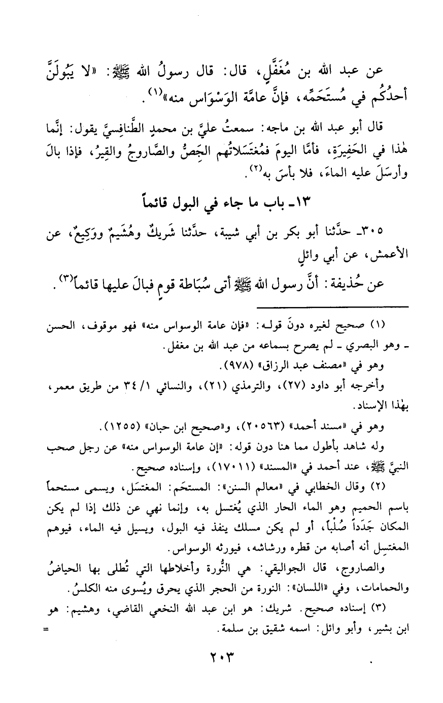305- حَدَّثَنَا أَبُو بَكْرِ بْنُ أَبِي شَيْبَةَ ، حَدَّثَنَا شَرِيكٌ ، وَهُشَيْمٌ ، وَوَكِيعٌ ، عَنِ الأَعْمَشِ ، عَنْ أَبِي وَائِلٍ ، عَنْ حُذَيْفَةَ ، أَنَّ رَسُولَ اللهِ صَلَّى الله عَليْهِ وسَلَّمَ أَتَى سُبَاطَةَ قَوْمٍ ، فَبَالَ عَلَيْهَا قَائِمًا.