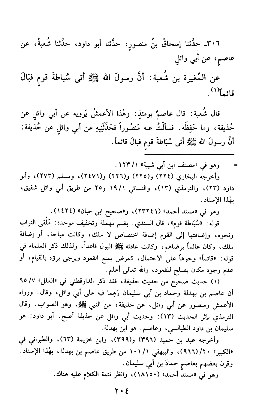 306- حَدَّثَنَا إِسْحَاقُ بْنُ مَنْصُورٍ ، حَدَّثَنَا أَبُو دَاوُدَ ، حَدَّثَنَا شُعْبَةُ ، عَنْ عَاصِمٍ ، عَنْ أَبِي وَائِلٍ ، عَنِ الْمُغِيرَةِ بْنِ شُعْبَةَ ، أَنَّ رَسُولَ اللهِ صَلَّى الله عَليْهِ وسَلَّمَ أَتَى سُبَاطَةَ قَوْمٍ ، فَبَالَ قَائِمًا.