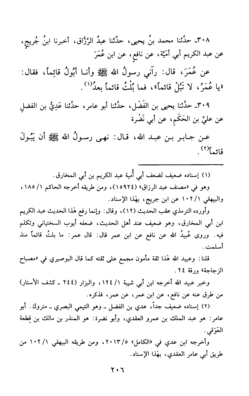 308- حَدَّثَنَا مُحَمَّدُ بْنُ يَحْيَى ، حَدَّثَنَا عَبْدُ الرَّزَّاقِ ، أَخْبَرَنَا ابْنُ جُرَيْجٍ ، عَنْ عَبْدِ الْكَرِيمِ أَبِي أُمَيَّةَ ، عَنْ نَافِعٍ ، عَنِ ابْنِ عُمَرَ ، عَنْ عُمَرَ ، قَالَ : رَآنِي رَسُولُ اللهِ صَلَّى الله عَليْهِ وسَلَّمَ وَأَنَا أَبُولُ قَائِمًا ، فَقَالَ : يَا عُمَرُ لاَ تَبُلْ قَائِمًا , فَمَا بُلْتُ قَائِمًا بَعْدُ.