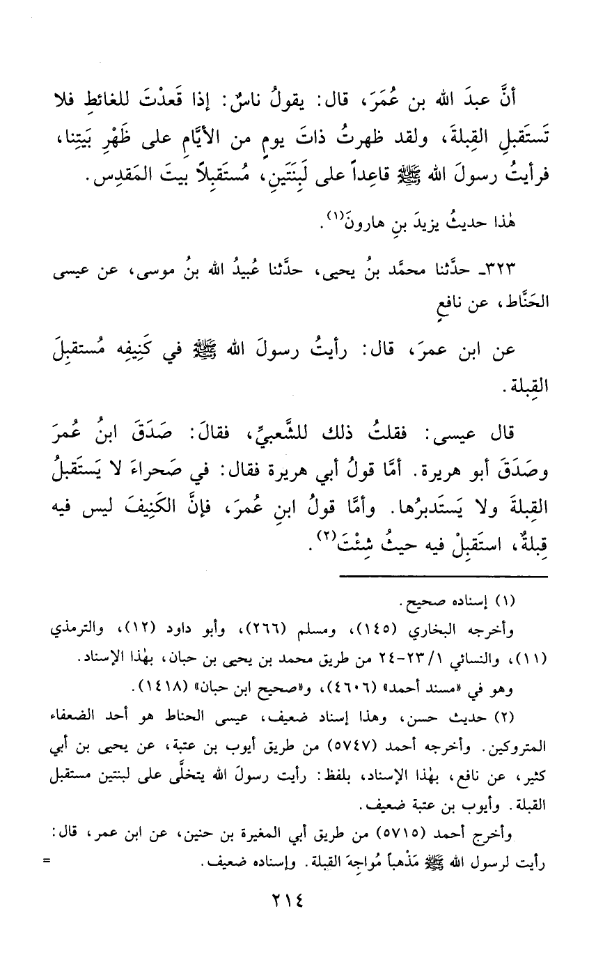 323- حَدَّثَنَا مُحَمَّدُ بْنُ يَحْيَى ، حَدَّثَنَا عُبَيْدُ اللهِ بْنُ مُوسَى ، عَنْ عِيسَى الْحَنَّاطِ ، عَنْ نَافِعٍ ، عَنِ ابْنِ عُمَرَ ، قَالَ : رَأَيْتُ رَسُولَ اللهِ صَلَّى الله عَليْهِ وسَلَّمَ فِي كَنِيفِهِ ، مُسْتَقْبِلَ الْقِبْلَةِ.