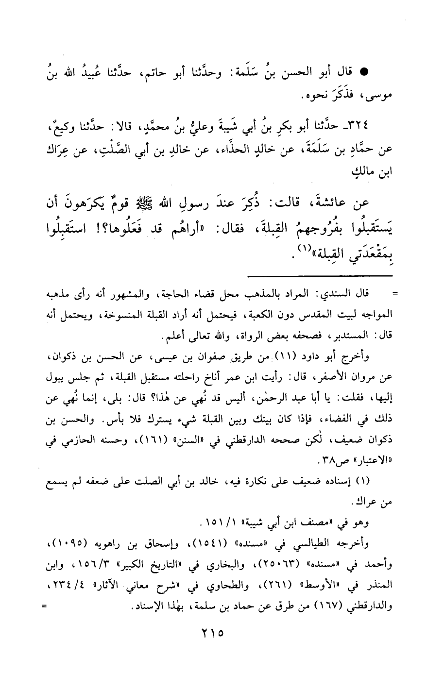 324- حَدَّثَنَا أَبُو بَكْرِ بْنُ أَبِي شَيْبَةَ ، وَعَلِيُّ بْنُ مُحَمَّدٍ ، قَالاَ : حَدَّثَنَا وَكِيعٌ ، عَنْ حَمَّادِ بْنِ سَلَمَةَ ، عَنْ خَالِدٍ الْحَذَّاءِ ، عَنْ خَالِدِ بْنِ أَبِي الصَّلْتِ ، عَنْ عِرَاكِ بْنِ مَالِكٍ ، عَنْ عَائِشَةَ قَالَتْ : ذُكِرَ عِنْدَ رَسُولِ اللهِ صَلَّى الله عَليْهِ وسَلَّمَ قَوْمٌ يَكْرَهُونَ أَنْ يَسْتَقْبِلُوا بِفُرُوجِهِمُ الْقِبْلَةَ ، فَقَالَ : أُرَاهُمْ قَدْ فَعَلُوهَا ، اسْتَقْبِلُوا بِمَقْعَدَتِي الْقِبْلَةَ.