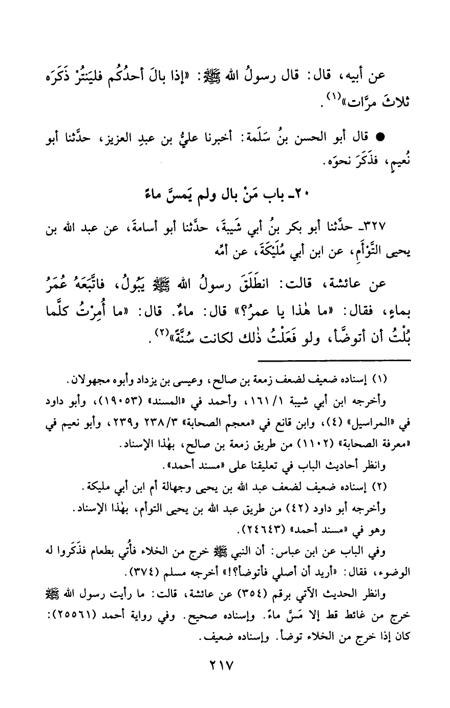 327- حَدَّثَنَا أَبُو بَكْرِ بْنُ أَبِي شَيْبَةَ ، حَدَّثَنَا أَبُو أُسَامَةَ ، عَنْ عَبْدِ اللهِ بْنِ يَحْيَى التَّوْأَمِ ، عَنِ ابْنِ أَبِي مُلَيْكَةَ ، عَنْ أُمِّهِ ، عَنْ عَائِشَةَ قَالَتْ : انْطَلَقَ النَّبِيُّ صَلَّى الله عَليْهِ وسَلَّمَ يَبُولُ ، فَاتَّبَعَهُ عُمَرُ بِمَاءٍ ، فَقَالَ : مَا هَذَا يَا عُمَرُ ؟ قَالَ : مَاءٌ ، قَالَ : مَا أُمِرْتُ كُلَّمَا بُلْتُ أَنْ أَتَوَضَّأَ ، وَلَوْ فَعَلْتُ ذَلِكَ لَكَانَتْ سُنَّةً.