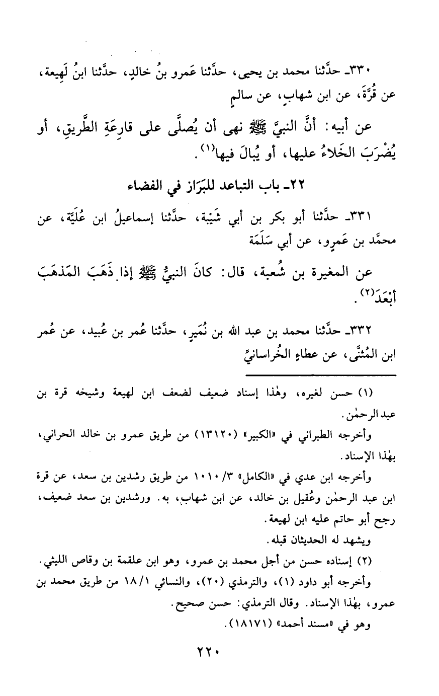 330- حَدَّثَنَا مُحَمَّدُ بْنُ يَحْيَى ، حَدَّثَنَا عَمْرُو بْنُ خَالِدٍ ، حَدَّثَنَا ابْنُ لَهِيعَةَ ، عَنْ قُرَّةَ ، عَنِ ابْنِ شِهَابٍ ، عَنْ سَالِمٍ ، عَنْ أَبِيهِ ؛ أَنَّ النَّبِيَّ صَلَّى الله عَليْهِ وسَلَّمَ نَهَى أَنْ يُصَلَّى عَلَى قَارِعَةِ الطَّرِيقِ ، أَوْ يُضْرَبَ الْخَلاَءُ عَلَيْهَا ، أَوْ يُبَالَ فِيهَا.