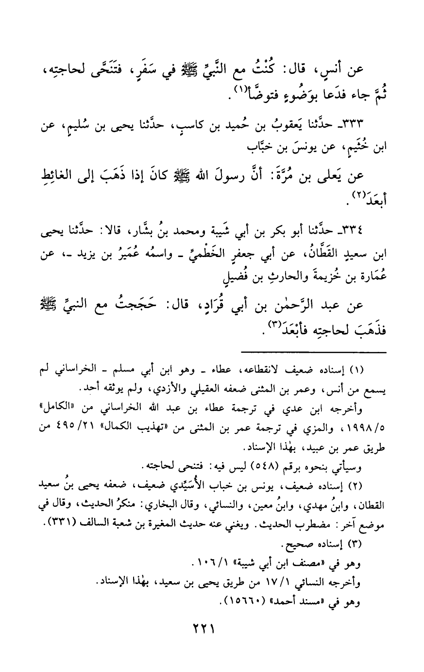 334- حَدَّثَنَا أَبُو بَكْرِ بْنُ أَبِي شَيْبَةَ ، وَمُحَمَّدُ بْنُ بَشَّارٍ ، قَالاَ : حَدَّثَنَا يَحْيَى بْنُ سَعِيدٍ الْقَطَّانُ ، عَنْ أَبِي جَعْفَرٍ الْخَطْمِيِّ ، وَاسْمُهُ : عُمَيْرُ بْنُ يَزِيدَ ، عَنْ عُمَارَةَ بْنِ خُزَيْمَةَ ، وَالْحَارِثُ بْنُ فُضَيْلٍ ، عَنْ عَبْدِ الرَّحْمَنِ بْنِ أَبِي قُرَادٍ ، قَالَ : حَجَجْتُ مَعَ النَّبِيِّ صَلَّى الله عَليْهِ وسَلَّمَ , فَذَهَبَ لِحَاجَتِهِ فَأَبْعَدَ.