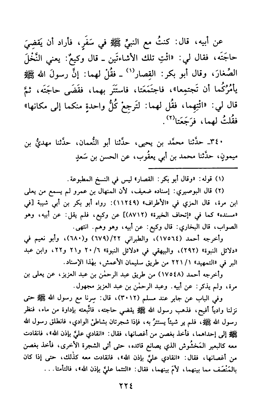 340- حَدَّثَنَا مُحَمَّدُ بْنُ يَحْيَى ، حَدَّثَنَا أَبُو النُّعْمَانِ ، حَدَّثَنَا مَهْدِيُّ بْنُ مَيْمُونٍ ، حَدَّثَنَا مُحَمَّدُ بْنُ أَبِي يَعْقُوبَ ، عَنِ الْحَسَنِ بْنِ سَعْدٍ ، عَنْ عَبْدِ اللهِ بْنِ جَعْفَرٍ قَالَ : كَانَ أَحَبَّ مَا اسْتَتَرَ بِهِ النَّبِيُّ صَلَّى الله عَليْهِ وسَلَّمَ لِحَاجَتِهِ ، هَدَفٌ ، أَوْ حَائِشُ نَخْلٍ.