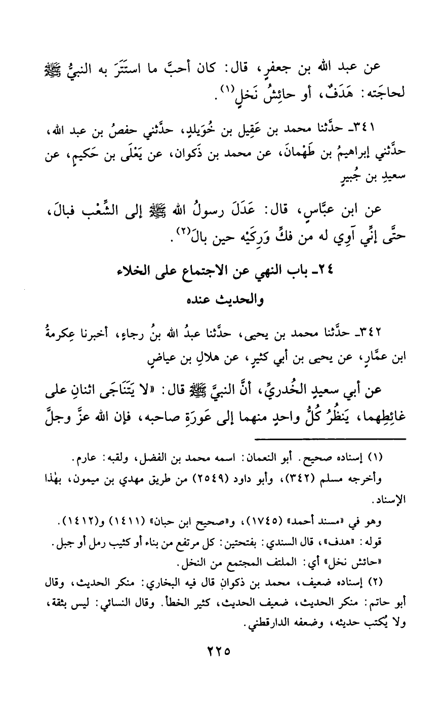 342- حَدَّثَنَا مُحَمَّدُ بْنُ يَحْيَى ، حَدَّثَنَا عَبْدُ اللهِ بْنُ رَجَاءٍ ، أَخْبَرَنَا عِكْرِمَةُ بْنُ عَمَّارٍ ، عَنْ يَحْيَى بْنِ أَبِي كَثِيرٍ ، عَنْ هِلاَلِ بْنِ عِيَاضٍ ، عَنْ أَبِي سَعِيدٍ الْخُدْرِيِّ , أَنَّ النَّبِيَّ صَلَّى الله عَليْهِ وسَلَّمَ قَالَ : لاَ يَتَنَاجَى اثْنَانِ عَلَى غَائِطِهِمَا ، يَنْظُرُ كُلُّ وَاحِدٍ مِنْهُمَا إِلَى عَوْرَةِ صَاحِبِهِ ، فَإِنَّ اللَّهَ عَزَّ وَجَلَّ يَمْقُتُ عَلَى ذَلِكَ.