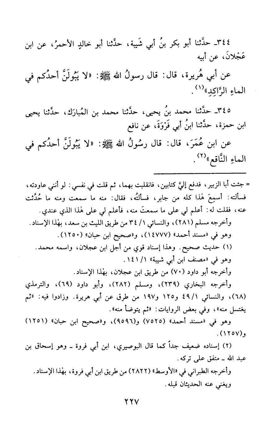 344- حَدَّثَنَا أَبُو بَكْرِ بْنُ أَبِي شَيْبَةَ ، حَدَّثَنَا أَبُو خَالِدٍ الأَحْمَرُ ، عَنِ ابْنِ عَجْلاَنَ ، عَنْ أَبِيهِ ، عَنْ أَبِي هُرَيْرَةَ قَالَ : قَالَ رَسُولُ اللهِ صَلَّى الله عَليْهِ وسَلَّمَ : لاَ يَبُولَنَّ أَحَدُكُمْ فِي الْمَاءِ الرَّاكِدِ.