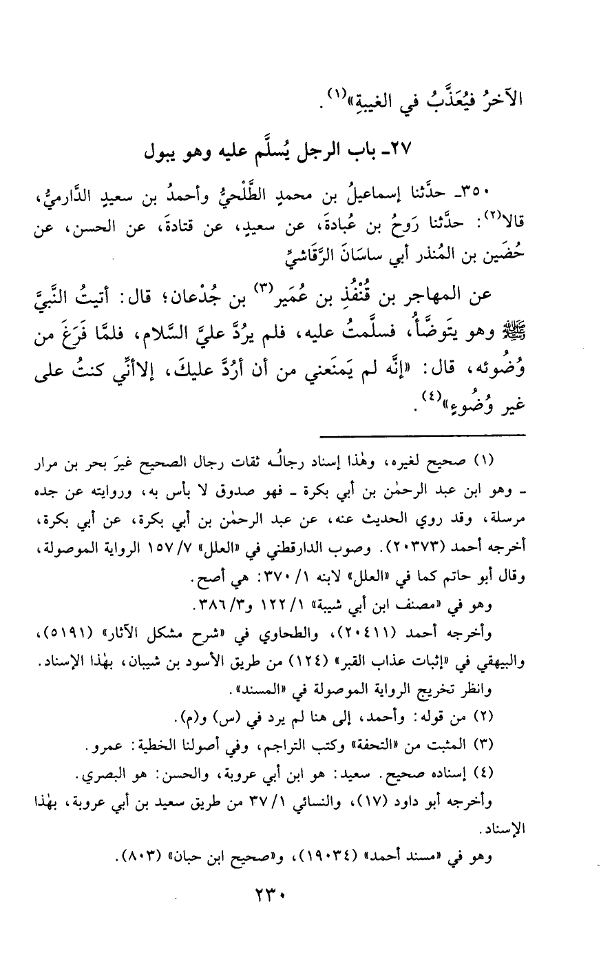 350- حَدَّثَنَا إِسْمَاعِيلُ بْنُ مُحَمَّدٍ الطَّلْحِيُّ , وَأَحْمَدُ بْنُ سَعِيدٍ الدَّارِمِيُّ ، قَالاَ : حَدَّثَنَا رَوْحُ بْنُ عُبَادَةَ ، عَنْ سَعِيدٍ ، عَنْ قَتَادَةَ ، عَنِ الْحَسَنِ ، عَنْ حُضَيْنِ بْنِ الْمُنْذِرِ أَبِي سَاسَانَ الرَّقَاشِيِّ ، عَنِ الْمُهَاجِرِ بْنِ قُنْفُذِ بْنِ عُمَيْرِ بْنِ جُدْعَانَ ، قَالَ : أَتَيْتُ النَّبِيَّ صَلَّى الله عَليْهِ وسَلَّمَ وَهُوَ يَتَوَضَّأُ ، فَسَلَّمْتُ عَلَيْهِ ، فَلَمْ يَرُدَّ عَلَيَّ السَّلاَمَ ، فَلَمَّا فَرَغَ مِنْ وُضُوئِهِ ، قَالَ : إِنَّهُ لَمْ يَمْنَعْنِي مِنْ أَنْ أَرُدَّ عَلَيْكَ , إِلاَّ أَنِّي كُنْتُ عَلَى غَيْرِ وُضُوءٍ.