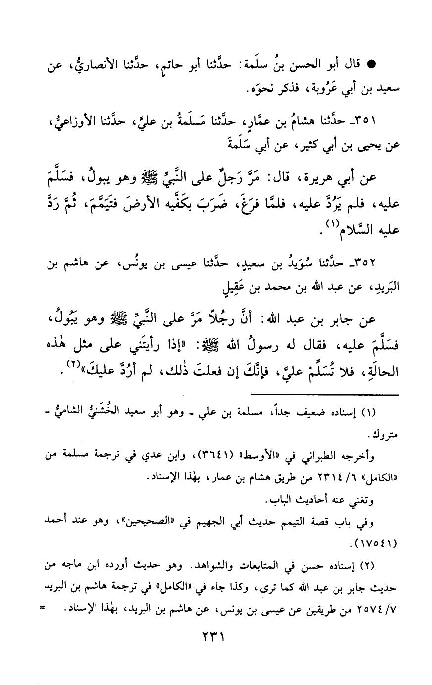 352- حَدَّثَنَا سُوَيْدُ بْنُ سَعِيدٍ ، حَدَّثَنَا عِيسَى بْنُ يُونُسَ ، عَنْ هَاشِمِ بْنِ الْبَرِيدِ ، عَنْ عَبْدِ اللهِ بْنِ مُحَمَّدِ بْنِ عَقِيلٍ ، عَنْ جَابِرِ بْنِ عَبْدِ اللهِ , أَنَّ رَجُلاً مَرَّ عَلَى النَّبِيِّ صَلَّى الله عَليْهِ وسَلَّمَ وَهُوَ يَبُولُ ، فَسَلَّمَ عَلَيْهِ ، فَقَالَ لَهُ رَسُولُ اللهِ صَلَّى الله عَليْهِ وسَلَّمَ : إِذَا رَأَيْتَنِي عَلَى مِثْلِ هَذِهِ الْحَالَةِ ، فَلاَ تُسَلِّمْ عَلَيَّ ، فَإِنَّكَ إِنْ فَعَلْتَ ذَلِكَ لَمْ أَرُدَّ عَلَيْكَ.