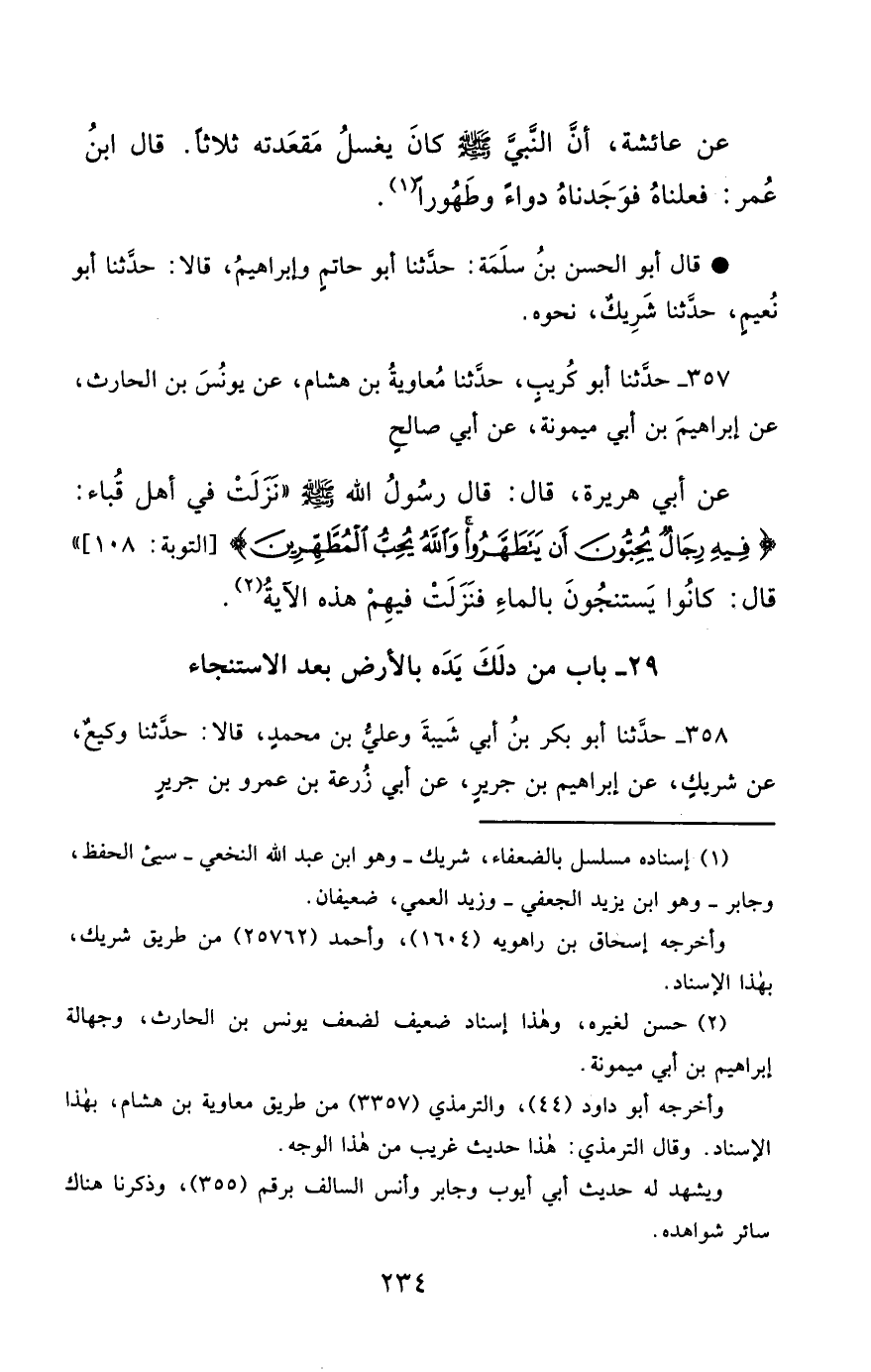 358- حَدَّثَنَا أَبُو بَكْرِ بْنُ أَبِي شَيْبَةَ , وَعَلِيُّ بْنُ مُحَمَّدٍ ، قَالاَ : حَدَّثَنَا وَكِيعٌ ، عَنْ شَرِيكٍ ، عَنْ إِبْرَاهِيمَ بْنِ جَرِيرٍ ، عَنْ أَبِي زُرْعَةَ بْنِ عَمْرِو بْنِ جَرِيرٍ ، عَنْ أَبِي هُرَيْرَةَ ، أَنَّ النَّبِيَّ صَلَّى الله عَليْهِ وسَلَّمَ قَضَى حَاجَتَهُ ، ثُمَّ اسْتَنْجَى مِنْ تَوْرٍ ، ثُمَّ دَلَكَ يَدَهُ بِالأَرْضِ .