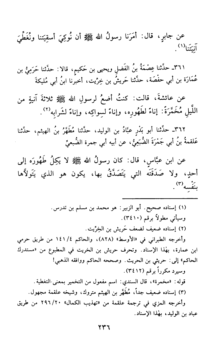 361- حَدَّثَنَا عِصْمَةُ بْنُ الْفَضْلِ , وَيَحْيَى بْنُ حَكِيمٍ , قَالاَ : حَدَّثَنَا حَرَمِيُّ بْنُ عُمَارَةَ بْنِ أَبِي حَفْصَةَ ، حَدَّثَنَا حَرِيشُ بْنُ الْخِرِّيتِ ، أَخْبَرَنَا ابْنُ أَبِي مُلَيْكَةَ ، عَنْ عَائِشَةَ قَالَتْ : كُنْتُ أَضَعُ لِرَسُولِ اللهِ صَلَّى الله عَليْهِ وسَلَّمَ ثَلاَثَةَ آنِيَةٍ مِنَ اللَّيْلِ مُخَمَّرَةً ، إِنَاءً لِطَهُورِهِ ، وَإِنَاءً لِسِوَاكِهِ ، وَإِنَاءً لِشَرَابِهِ.