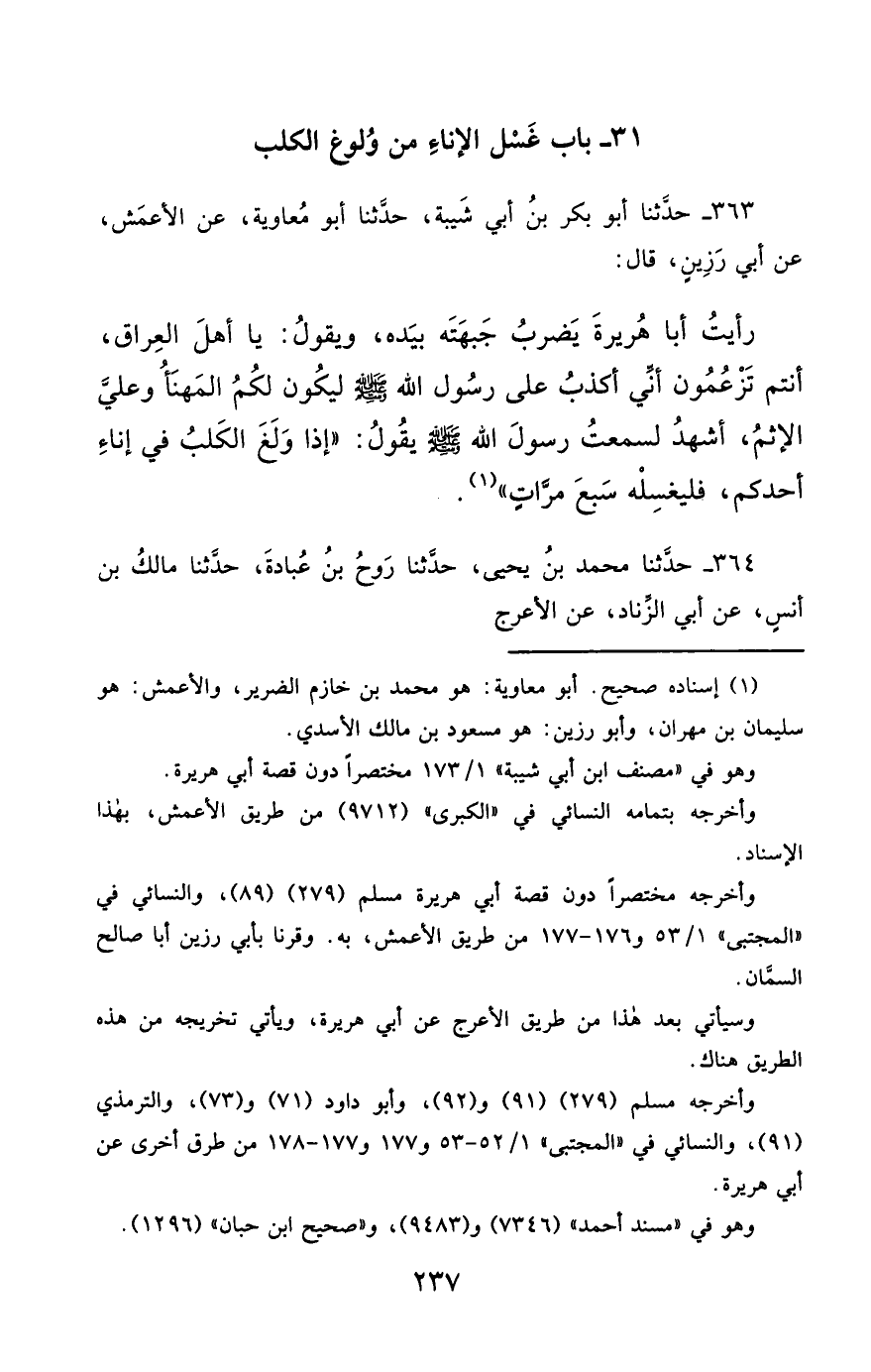 363- حَدَّثَنَا أَبُو بَكْرِ بْنُ أَبِي شَيْبَةَ ، حَدَّثَنَا أَبُو مُعَاوِيَةَ ، عَنِ الأَعْمَشِ ، عَنْ أَبِي رَزِينٍ قَالَ : رَأَيْتُ أَبَا هُرَيْرَةَ يَضْرِبُ جَبْهَتَهُ بِيَدِهِ ، وَيَقُولُ : يَا أَهْلَ الْعِرَاقِ , أَنْتُمْ تَزْعُمُونَ أَنِّي أَكْذِبُ عَلَى رَسُولِ اللهِ صَلَّى الله عَليْهِ وسَلَّمَ ، لِيَكُونَ لَكُمُ الْمَهْنَأُ ، وَعَلَيَّ الإِثْمُ ، أَشْهَدُ لَسَمِعْتُ رَسُولَ اللهِ صَلَّى الله عَليْهِ وسَلَّمَ يَقُولُ : إِذَا وَلَغَ الْكَلْبُ فِي إِنَاءِ أَحَدِكُمْ ، فَلْيَغْسِلْهُ سَبْعَ مَرَّاتٍ.