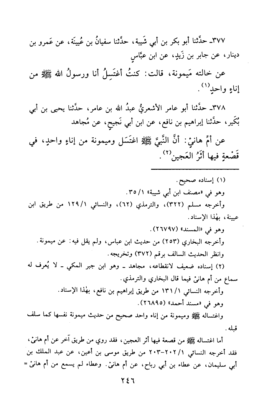 378- حَدَّثَنَا أَبُو عَامِرٍ الأَشْعَرِيُّ ، عَبْدُ اللهِ بْنُ عَامِرٍ ، حَدَّثَنَا يَحْيَى بْنُ أَبِي بُكَيْرٍ ، حَدَّثَنَا إِبْرَاهِيمُ بْنُ نَافِعٍ ، عَنِ ابْنِ أَبِي نَجِيحٍ ، عَنْ مُجَاهِدٍ ، عَنْ أُمِّ هَانِئٍ , أَنَّ النَّبِيَّ صَلَّى الله عَليْهِ وسَلَّمَ اغْتَسَلَ وَمَيْمُونَةَ مِنْ إِنَاءٍ وَاحِدٍ فِي قَصْعَةٍ فِيهَا أَثَرُ الْعَجِينِ.