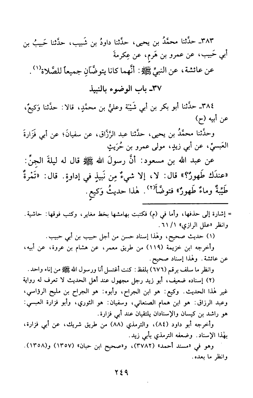 384- حَدَّثَنَا أَبُو بَكْرِ بْنُ أَبِي شَيْبَةَ , وَعَلِيُّ بْنُ مُحَمَّدٍ ، قَالاَ : حَدَّثَنَا وَكِيعٌ ، عَنْ أَبِيهِ (ح) وحَدَّثَنَا مُحَمَّدُ بْنُ يَحْيَى ، حَدَّثَنَا عَبْدُ الرَّزَّاقِ ، عَنْ سُفْيَانَ ، عَنْ أَبِي فَزَارَةَ الْعَبْسِيِّ ، عَنْ أَبِي زَيْدٍ , مَوْلَى عَمْرِو بْنِ حُرَيْثٍ ، عَنْ عَبْدِ اللهِ بْنِ مَسْعُودٍ ، أَنَّ رَسُولَ اللهِ صَلَّى الله عَليْهِ وسَلَّمَ قَالَ لَهُ لَيْلَةَ الْجِنِّ : عِنْدَكَ طَهُورٌ ؟ قَالَ : لاَ ، إِلاَّ شَيْءٌ مِنْ نَبِيذٍ فِي إِدَاوَةٍ ، قَالَ : تَمْرَةٌ طَيِّبَةٌ ، وَمَاءٌ طَهُورٌ , فَتَوَضَّأَ.
