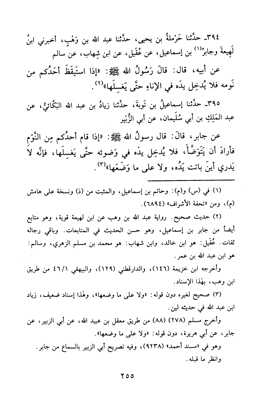 394- حَدَّثَنَا حَرْمَلَةُ بْنُ يَحْيَى ، حَدَّثَنَا عَبْدُ اللهِ بْنُ وَهْبٍ ، أَخْبَرَنِي ابْنُ لَهِيعَةَ , وَجَابِرُ بْنُ إِسْمَاعِيلَ ، عَنْ عُقَيْلٍ ، عَنِ ابْنِ شِهَابٍ ، عَنْ سَالِمٍ ، عَنْ أَبِيهِ قَالَ : قَالَ رَسُولُ اللهِ صَلَّى الله عَليْهِ وسَلَّمَ : إِذَا اسْتَيْقَظَ أَحَدُكُمْ مِنْ نَوْمِهِ ، فَلاَ يُدْخِلْ يَدَهُ فِي الإِنَاءِ حَتَّى يَغْسِلَهَا.