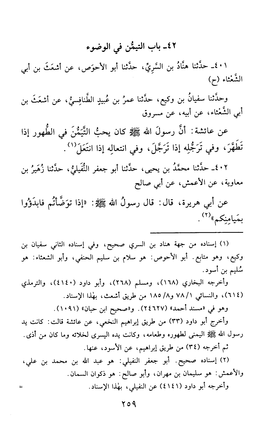 401- حَدَّثَنَا هَنَّادُ بْنُ السَّرِيِّ ، حَدَّثَنَا أَبُو الأَحْوَصِ ، عَنْ أَشْعَثَ بْنِ أَبِي الشَّعْثَاءِ (ح) وحَدَّثَنَا سُفْيَانُ بْنُ وَكِيعٍ ، حَدَّثَنَا عُمَرُ بْنُ عُبَيْدٍ الطَّنَافِسِيُّ ، عَنْ أَشْعَثَ بْنِ أَبِي الشَّعْثَاءِ ، عَنْ أَبِيهِ ، عَنْ مَسْرُوقٍ ، عَنْ عَائِشَةَ ، أَنَّ رَسُولَ اللهِ صَلَّى الله عَليْهِ وسَلَّمَ كَانَ يُحِبُّ التَّيَمُّنَ فِي الطُّهُورِ إِذَا تَطَهَّرَ ، وَفِي تَرَجُّلِهِ إِذَا تَرَجَّلَ ، وَفِي انْتِعَالِهِ إِذَا انْتَعَلَ.