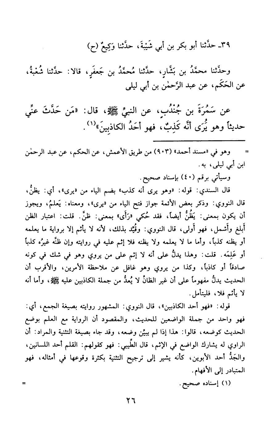 39- حَدَّثَنَا أَبُو بَكْرِ بْنُ أَبِي شَيْبَةَ ، حَدَّثَنَا وَكِيعٌ (ح) وَحَدَّثَنَا مُحَمَّدُ بْنُ بَشَّارٍ ، حَدَّثَنَا مُحَمَّدُ بْنُ جَعْفَرٍ ، قَالاَ : حَدَّثَنَا شُعْبَةُ ، عَنِ الْحَكَمِ ، عَنْ عَبْدِ الرَّحْمَنِ بْنِ أَبِي لَيْلَى ، عَنْ سَمُرَةَ بْنِ جُنْدَبٍ ، عَنِ النَّبِيِّ صَلَّى الله عَليْهِ وسَلَّمَ قَالَ : مَنْ حَدَّثَ عَنِّي حَدِيثًا , وَهُوَ يُرَى أَنَّهُ كَذِبٌ ، فَهُوَ أَحَدُ الْكَاذِبَيْنِ.