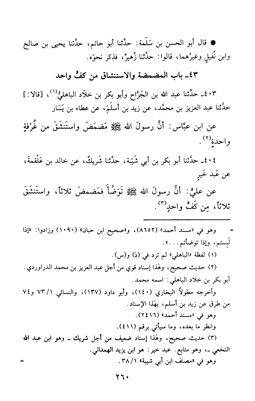 403- حَدَّثَنَا عَبْدُ اللهِ بْنُ الْجَرَّاحِ , وَأَبُو بَكْرِ بْنُ خَلاَّدٍ الْبَاهِلِيُّ , قَالاَ : حَدَّثَنَا عَبْدُ الْعَزِيزِ بْنُ مُحَمَّدٍ ، عَنْ زَيْدِ بْنِ أَسْلَمَ ، عَنْ عَطَاءِ بْنِ يَسَارٍ ، عَنِ ابْنِ عَبَّاسٍ , أَنَّ رَسُولَ اللهِ صَلَّى الله عَليْهِ وسَلَّمَ مَضْمَضَ وَاسْتَنْشَقَ مِنْ غُرْفَةٍ وَاحِدَةٍ.