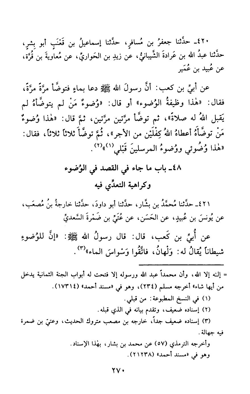 421- حَدَّثَنَا مُحَمَّدُ بْنُ بَشَّارٍ ، حَدَّثَنَا أَبُو دَاوُدَ ، حَدَّثَنَا خَارِجَةُ بْنُ مُصْعَبٍ ، عَنْ يُونُسَ بْنِ عُبَيْدٍ ، عَنِ الْحَسَنِ ، عَنْ عُتَيِّ بْنِ ضَمْرَةَ السَّعْدِيِّ ، عَنْ أُبَيِّ بْنِ كَعْبٍ , قَالَ : قَالَ رَسُولُ اللهِ صَلَّى الله عَليْهِ وسَلَّمَ : إِنَّ لِلْوُضُوءِ شَيْطَانًا , يُقَالُ لَهُ وَلَهَانُ ، فَاتَّقُوا وَسْوَاسَ الْمَاءِ.