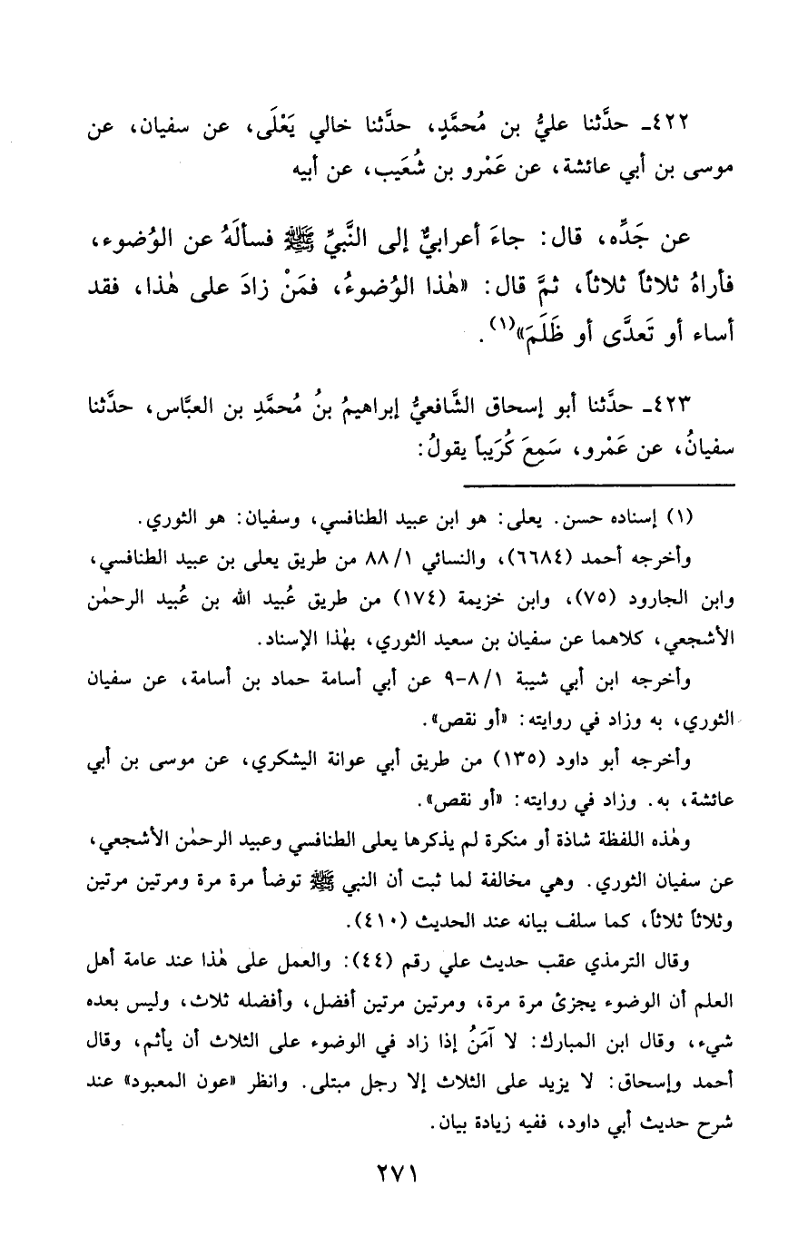 422- حَدَّثَنَا عَلِيُّ بْنُ مُحَمَّدٍ ، حَدَّثَنَا خَالِي يَعْلَى ، عَنْ سُفْيَانَ ، عَنْ مُوسَى بْنِ أَبِي عَائِشَةَ ، عَنْ عَمْرِو بْنِ شُعَيْبٍ ، عَنْ أَبِيهِ ، عَنْ جَدِّهِ ، قَالَ : جَاءَ أَعْرَابِيٌّ إِلَى النَّبِيِّ صَلَّى الله عَليْهِ وسَلَّمَ فَسَأَلَهُ عَنِ الْوُضُوءِ ، فَأَرَاهُ ثَلاَثًا ثَلاَثًا ، ثُمَّ قَالَ : هَذَا الْوُضُوءُ ، فَمَنْ زَادَ عَلَى هَذَا فَقَدْ أَسَاءَ ، أَوْ تَعَدَّى ، أَوْ ظَلَمَ.