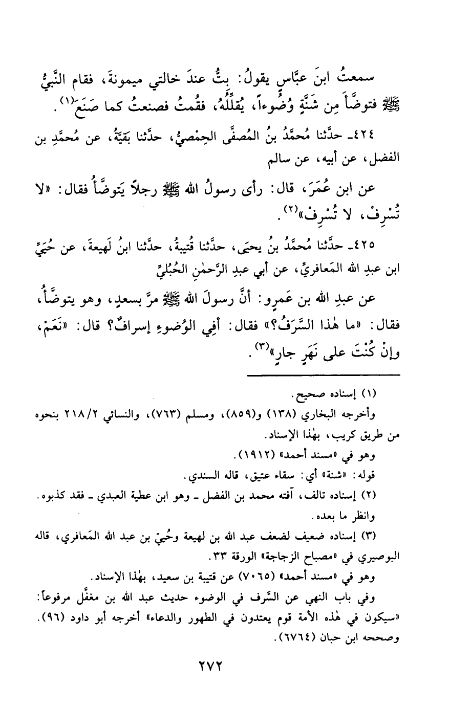 425- حَدَّثَنَا مُحَمَّدُ بْنُ يَحْيَى ، حَدَّثَنَا قُتَيْبَةُ ، حَدَّثَنَا ابْنُ لَهِيعَةَ ، عَنْ حُيَيِّ بْنِ عَبْدِ اللهِ الْمَعَافِرِيِّ ، عَنْ أَبِي عَبْدِ الرَّحْمَنِ الْحُبُلِيِّ ، عَنْ عَبْدِ اللهِ بْنِ عَمْرٍو ، أَنَّ رَسُولَ اللهِ صَلَّى الله عَليْهِ وسَلَّمَ مَرَّ بِسَعْدٍ وَهُوَ يَتَوَضَّأُ ، فَقَالَ : مَا هَذَا السَّرَفُ ؟ فَقَالَ : أَفِي الْوُضُوءِ إِسْرَافٌ ؟ قَالَ : نَعَمْ ، وَإِنْ كُنْتَ عَلَى نَهَرٍ جَارٍ.