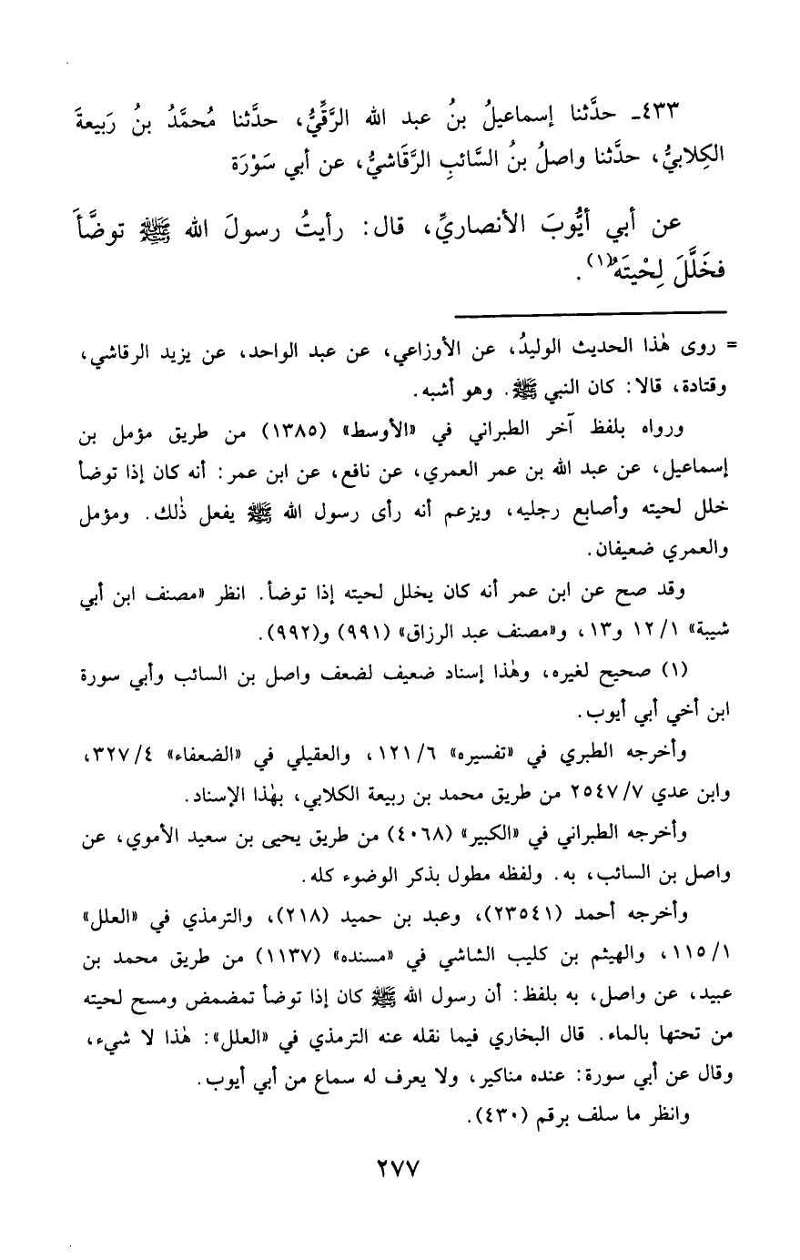 433- حَدَّثَنَا إِسْمَاعِيلُ بْنُ عَبْدِ اللهِ الرَّقِّيُّ ، حَدَّثَنَا مُحَمَّدُ بْنُ رَبِيعَةَ الْكِلاَبِيُّ ، حَدَّثَنَا وَاصِلُ بْنُ السَّائِبِ الرَّقَاشِيُّ ، عَنْ أَبِي سَوْرَةَ ، عَنْ أَبِي أَيُّوبَ الأَنْصَارِيِّ ، قَالَ : رَأَيْتُ رَسُولَ اللهِ صَلَّى الله عَليْهِ وسَلَّمَ تَوَضَّأَ ، فَخَلَّلَ لِحْيَتَهُ.