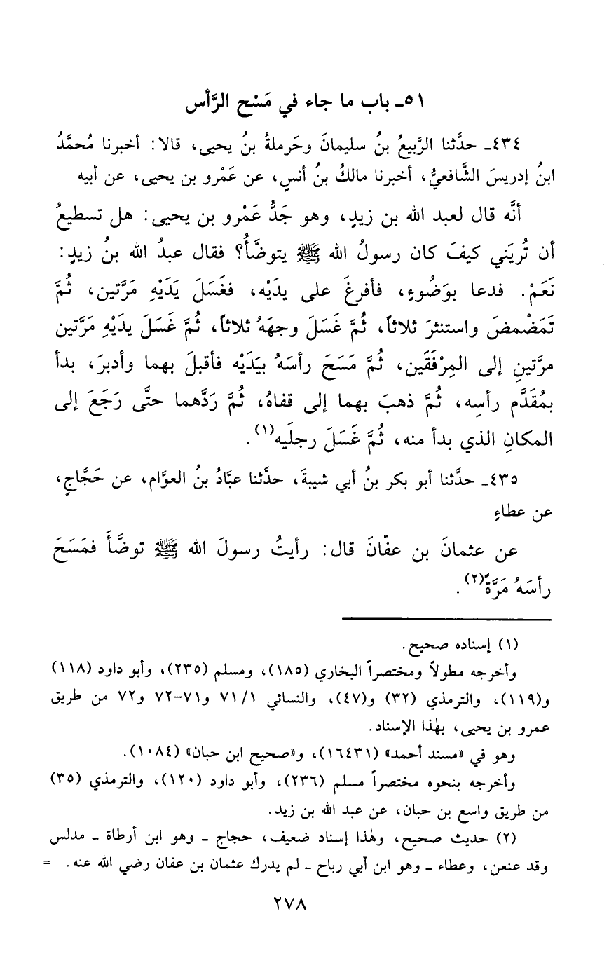 435- حَدَّثَنَا أَبُو بَكْرِ بْنُ أَبِي شَيْبَةَ ، حَدَّثَنَا عَبَّادُ بْنُ الْعَوَّامِ ، عَنْ حَجَّاجٍ ، عَنْ عَطَاءٍ ، عَنْ عُثْمَانَ بْنِ عَفَّانَ ، قَالَ : رَأَيْتُ رَسُولَ اللهِ صَلَّى الله عَليْهِ وسَلَّمَ تَوَضَّأَ ، فَمَسَحَ رَأْسَهُ مَرَّةً.