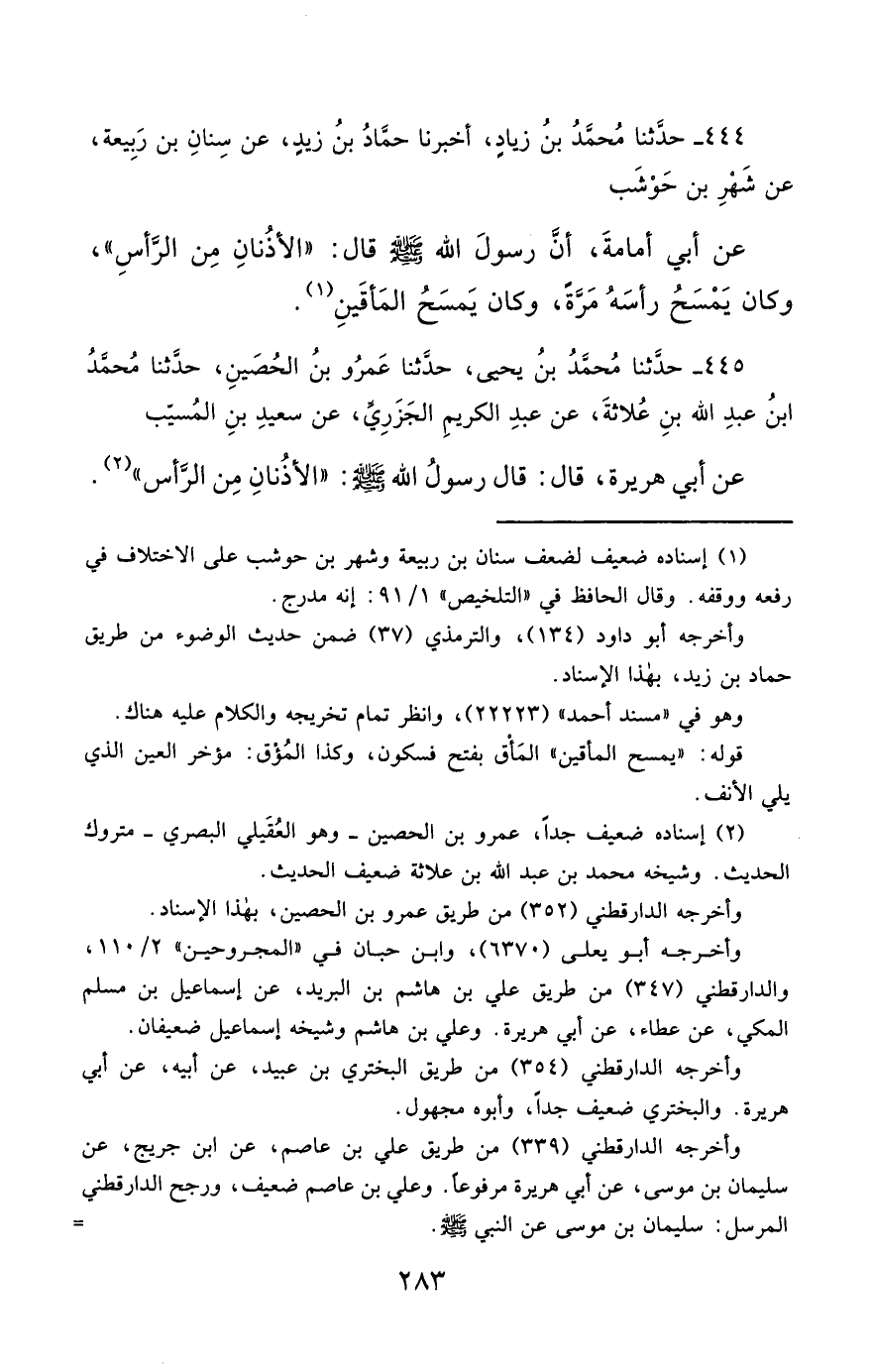 444- حَدَّثَنَا مُحَمَّدُ بْنُ زِيَادٍ ، أَخْبَرَنَا حَمَّادُ بْنُ زَيْدٍ ، عَنْ سِنَانِ بْنِ رَبِيعَةَ ، عَنْ شَهْرِ بْنِ حَوْشَبٍ ، عَنْ أَبِي أُمَامَةَ ، أَنَّ رَسُولَ اللهِ صَلَّى الله عَليْهِ وسَلَّمَ قَالَ : الأُذُنَانِ مِنَ الرَّأْسِ , وَكَانَ يَمْسَحُ رَأْسَهُ مَرَّةً ، وَكَانَ يَمْسَحُ الْمَأْقَيْنِ.