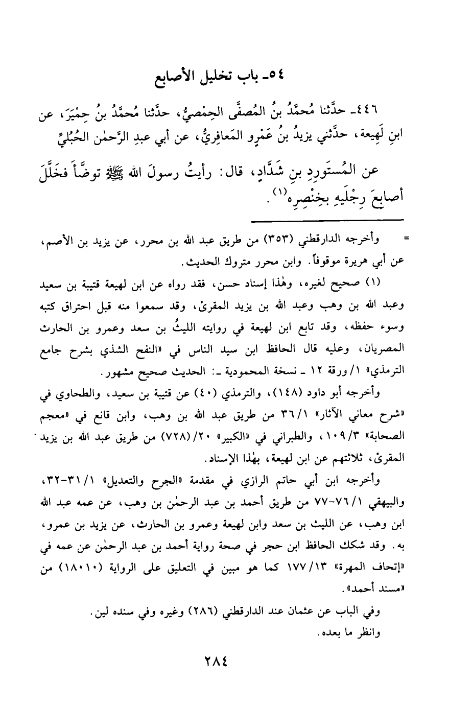446- حَدَّثَنَا مُحَمَّدُ بْنُ الْمُصَفَّى الْحِمْصِيُّ ، حَدَّثَنَا مُحَمَّدُ بْنُ حِمْيَرٍ ، عَنِ ابْنِ لَهِيعَةَ , حَدَّثَنِي يَزِيدُ بْنُ عَمْرٍو الْمَعَافِرِيُّ ، عَنْ أَبِي عَبْدِ الرَّحْمَنِ الْحُبُلِيِّ ، عَنِ الْمُسْتَوْرِدِ بْنِ شَدَّادٍ , قَالَ : رَأَيْتُ رَسُولَ اللهِ صَلَّى الله عَليْهِ وسَلَّمَ تَوَضَّأَ , فَخَلَّلَ أَصَابِعَ رِجْلَيْهِ بِخِنْصِرِهِ.