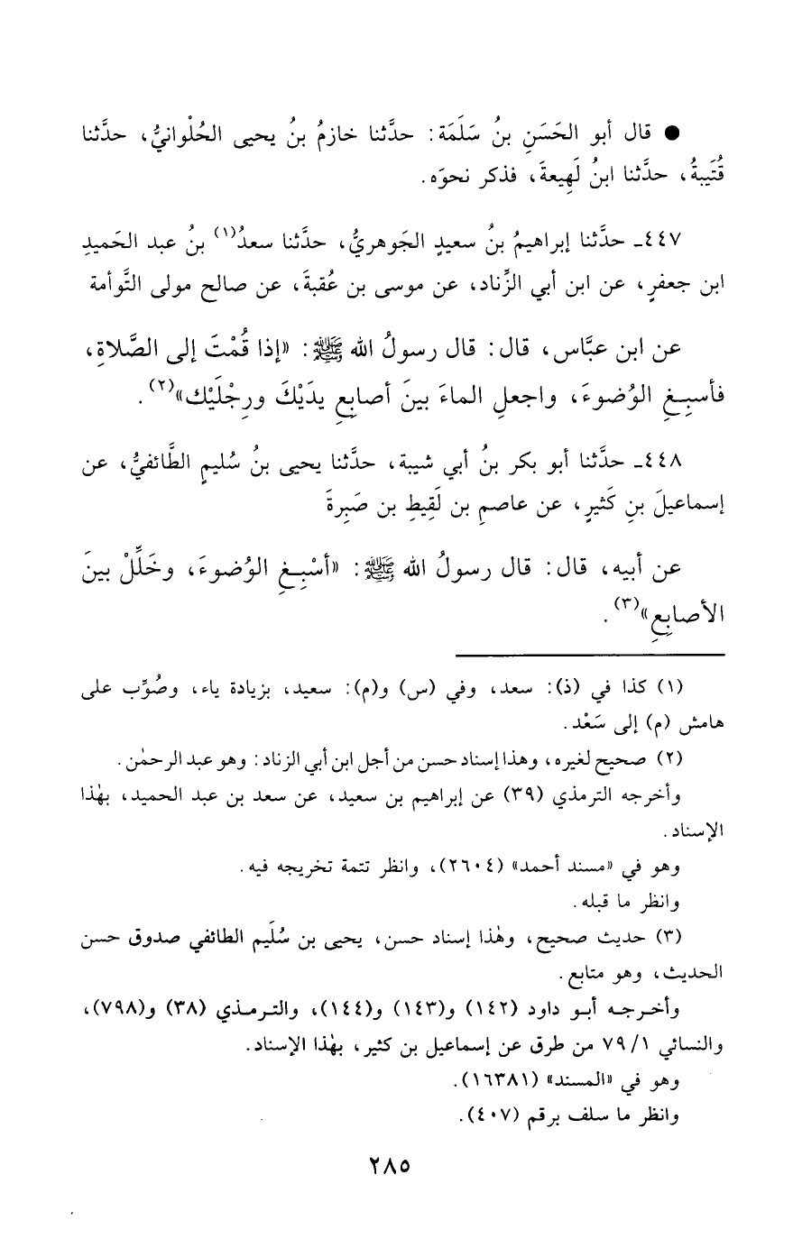 447- حَدَّثَنَا إِبْرَاهِيمُ بْنُ سَعِيدٍ الْجَوْهَرِيُّ ، حَدَّثَنَا سَعْدُ بْنُ عَبْدِ الْحَمِيدِ بْنِ جَعْفَرٍ ، عَنِ ابْنِ أَبِي الزِّنَادِ ، عَنْ مُوسَى بْنِ عُقْبَةَ ، عَنْ صَالِحٍ , مَوْلَى التَّوْأَمَةِ ، عَنِ ابْنِ عَبَّاسٍ , قَالَ : قَالَ رَسُولُ اللهِ صَلَّى الله عَليْهِ وسَلَّمَ : إِذَا قُمْتَ إِلَى الصَّلاَةِ ، فَأَسْبِغِ الْوُضُوءَ , وَاجْعَلِ الْمَاءَ بَيْنَ أَصَابِعِ يَدَيْكَ ، وَرِجْلَيْكَ.