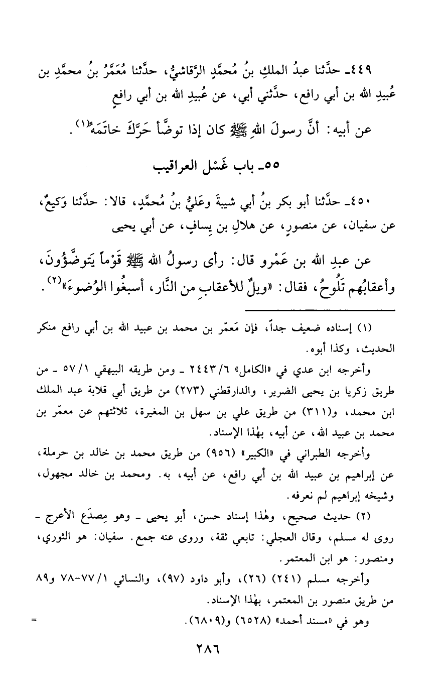 450- حَدَّثَنَا أَبُو بَكْرِ بْنُ أَبِي شَيْبَةَ , وَعَلِيُّ بْنُ مُحَمَّدٍ ، قَالاَ : حَدَّثَنَا وَكِيعٌ ، عَنْ سُفْيَانَ ، عَنْ مَنْصُورٍ ، عَنْ هِلاَلِ بْنِ يَسَافٍ ، عَنْ أَبِي يَحْيَى ، عَنْ عَبْدِ اللهِ بْنِ عَمْرٍو , قَالَ : رَأَى رَسُولُ اللهِ صَلَّى الله عَليْهِ وسَلَّمَ قَوْمًا يَتَوَضَّؤُونَ , وَأَعْقَابُهُمْ تَلُوحُ , فَقَالَ : وَيْلٌ لِلأَعْقَابِ مِنَ النَّارِ ، أَسْبِغُوا الْوُضُوءَ.
