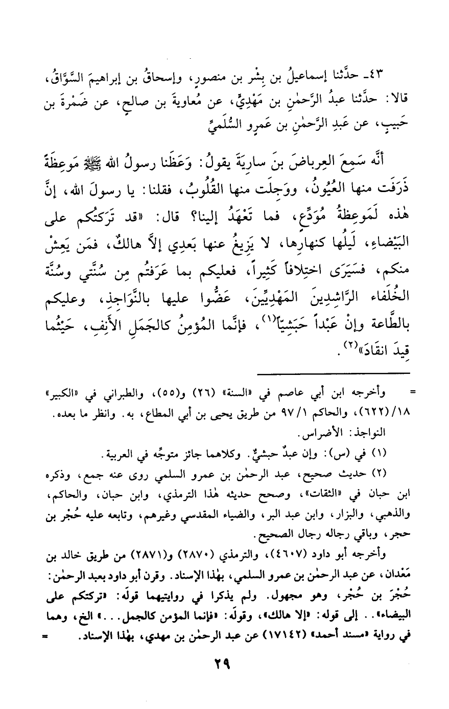43- حَدَّثَنَا إِسْمَاعِيلُ بْنُ بِشْرِ بْنِ مَنْصُورٍ ، وَإِسْحَاقُ بْنُ إِبْرَاهِيمَ السَّوَّاقُ ، قَالاَ : حَدَّثَنَا عَبْدُ الرَّحْمَنِ بْنُ مَهْدِيٍّ , عَنْ مُعَاوِيَةَ بْنِ صَالِحٍ ، عَنْ ضَمْرَةَ بْنِ حَبِيبٍ ، عَنْ عَبْدِ الرَّحْمَنِ بْنِ عَمْرٍو السُّلَمِيِّ ، أَنَّهُ سَمِعَ الْعِرْبَاضَ بْنَ سَارِيَةَ يَقُولُ : وَعَظَنَا رَسُولُ اللهِ صَلَّى الله عَليْهِ وسَلَّمَ مَوْعِظَةً , ذَرَفَتْ مِنْهَا الْعُيُونُ ، وَوَجِلَتْ مِنْهَا الْقُلُوبُ ، فَقُلْنَا : يَا رَسُولَ اللهِ ، إِنَّ هَذِهِ لَمَوْعِظَةُ مُوَدِّعٍ ، فَمَا تَعْهَدُ إِلَيْنَا ؟ قَالَ : قَدْ تَرَكْتُكُمْ عَلَى الْبَيْضَاءِ لَيْلُهَا كَنَهَارِهَا ، لاَ يَزِيغُ عَنْهَا بَعْدِي إِلاَّ هَالِكٌ ، فَمَنْ يَعِشْ مِنْكُمْ فَسَيَرَى اخْتِلاَفًا كَثِيرًا ، فَعَلَيْكُمْ بِمَا عَرَفْتُمْ مِنْ سُنَّتِي ، وَسُنَّةِ الْخُلَفَاءِ الرَّاشِدِينَ الْمَهْدِيِّينَ ، عَضُّوا عَلَيْهَا بِالنَّوَاجِذِ ، وَعَلَيْكُمْ بِالطَّاعَةِ ، وَإِنْ عَبْدًا حَبَشِيًّا ، فَإِنَّمَا الْمُؤْمِنُ كَالْجَمَلِ الأَنِفِ ، حَيْثُمَا قِيدَ انْقَادَ.