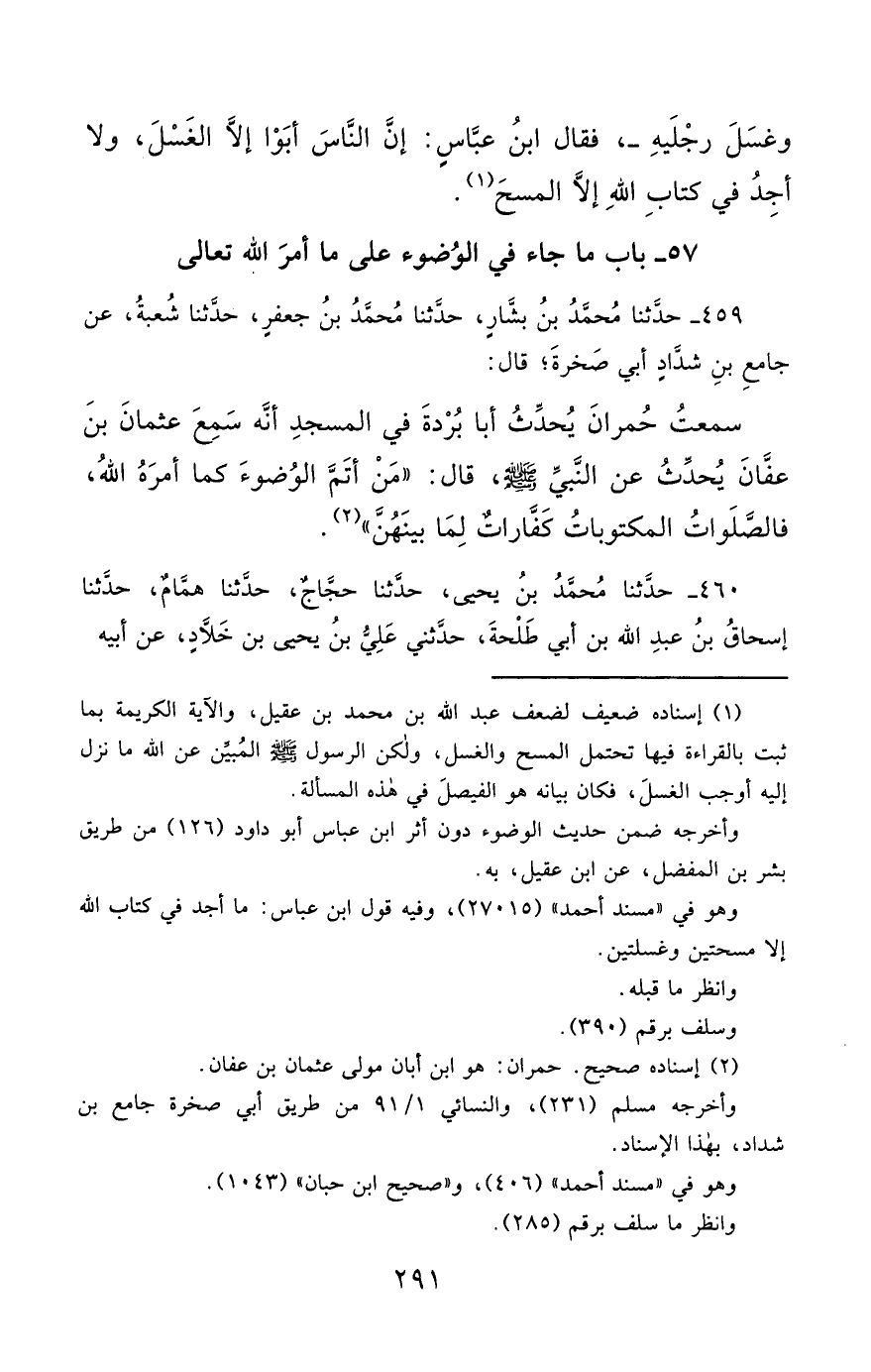460- حَدَّثَنَا مُحَمَّدُ بْنُ يَحْيَى ، حَدَّثَنَا حَجَّاجٌ ، حَدَّثَنَا هَمَّامٌ ، حَدَّثَنَا إِسْحَاقُ بْنُ عَبْدِ اللهِ بْنِ أَبِي طَلْحَةَ , حَدَّثَنِي عَلِيُّ بْنُ يَحْيَى بْنِ خَلاَّدٍ ، عَنْ أَبِيهِ ، عَنْ عَمِّهِ رِفَاعَةَ بْنِ رَافِعٍ ، أَنَّهُ كَانَ جَالِسًا عِنْدَ النَّبِيِّ صَلَّى الله عَليْهِ وسَلَّمَ فَقَالَ : إِنَّهَا لاَ تَتِمُّ صَلاَةٌ لأَحَدٍ ، حَتَّى يُسْبِغَ الْوُضُوءَ , كَمَا أَمَرَهُ اللَّهُ تَعَالَى ، يَغْسِلُ وَجْهَهُ وَيَدَيْهِ إِلَى الْمِرْفَقَيْنِ ، وَيَمْسَحُ بِرَأْسِهِ ، وَرِجْلَيْهِ إِلَى الْكَعْبَيْنِ.