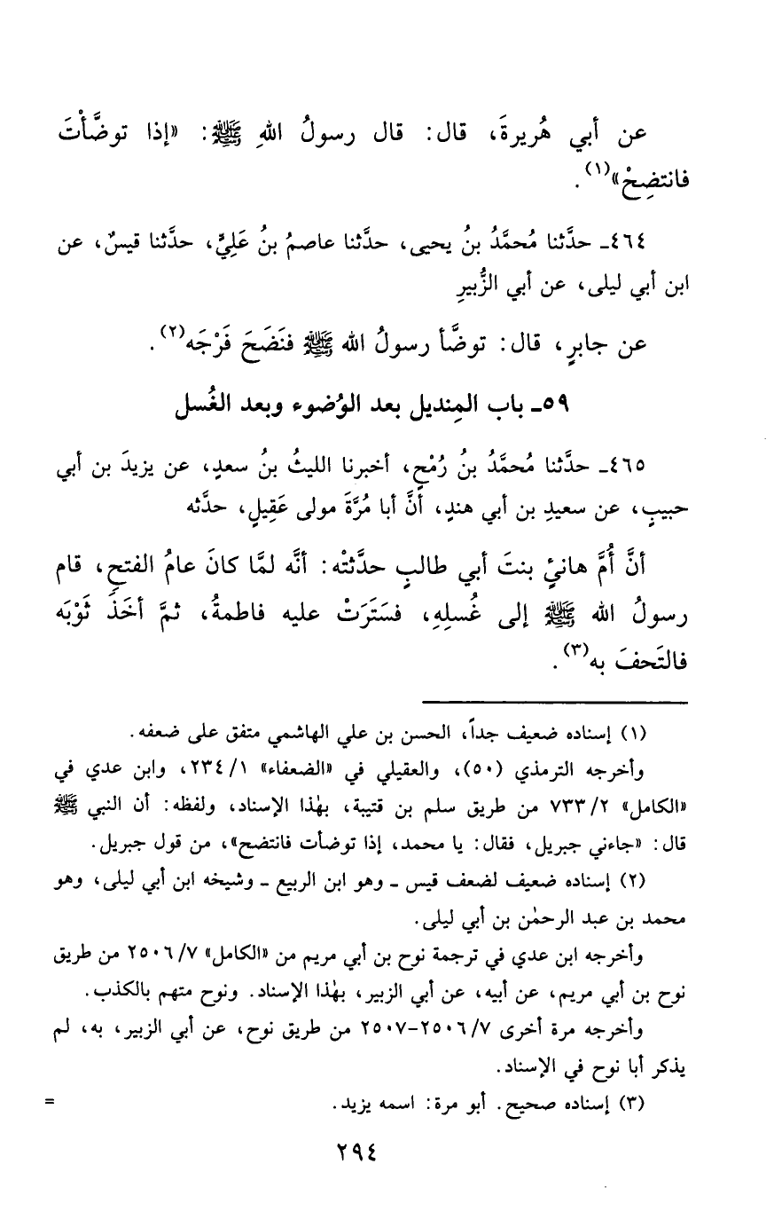 464- حَدَّثَنَا مُحَمَّدُ بْنُ يَحْيَى ، حَدَّثَنَا عَاصِمُ بْنُ عَلِيٍّ ، حَدَّثَنَا قَيْسٌ ، عَنِ ابْنِ أَبِي لَيْلَى ، عَنْ أَبِي الزُّبَيْرِ ، عَنْ جَابِرٍ ، قَالَ : تَوَضَّأَ رَسُولُ اللهِ صَلَّى الله عَليْهِ وسَلَّمَ ، فَنَضَحَ فَرْجَهُ.