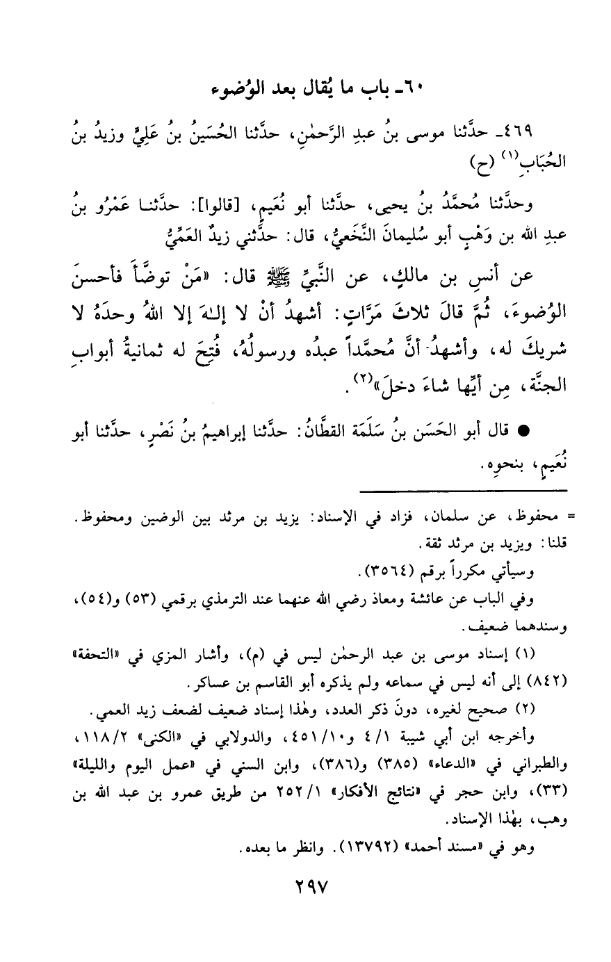 469- حَدَّثَنَا مُوسَى بْنُ عَبْدِ الرَّحْمَنِ ، حَدَّثَنَا الْحُسَيْنُ بْنُ عَلِيٍّ , وَزَيْدُ بْنُ الْحُبَابِ (ح) وحَدَّثَنَا مُحَمَّدُ بْنُ يَحْيَى ، حَدَّثَنَا أَبُو نُعَيْمٍ , قَالُوا : حَدَّثَنَا عَمْرُو بْنُ عَبْدِ اللهِ بْنِ وَهْبٍ أَبُو سُلَيْمَانَ النَّخَعِيُّ ، حَدَّثَنِي زَيْدٌ الْعَمِّيُّ ، عَنْ أَنَسِ بْنِ مَالِكٍ ، عَنِ النَّبِيِّ صَلَّى الله عَليْهِ وسَلَّمَ قَالَ : مَنْ تَوَضَّأَ ، فَأَحْسَنَ الْوُضُوءَ ، ثُمَّ قَالَ ثَلاَثَ مَرَّاتٍ : أَشْهَدُ أَنْ لاَ إِلَهَ إِلاَّ اللَّهُ , وَحْدَهُ لاَ شَرِيكَ لَهُ ، وَأَشْهَدُ أَنَّ مُحَمَّدًا عَبْدُهُ وَرَسُولُهُ ، فُتِحَ لَهُ ثَمَانِيَةُ أَبْوَابِ الْجَنَّةِ ، مِنْ أَيِّهَا شَاءَ ، دَخَلَ.