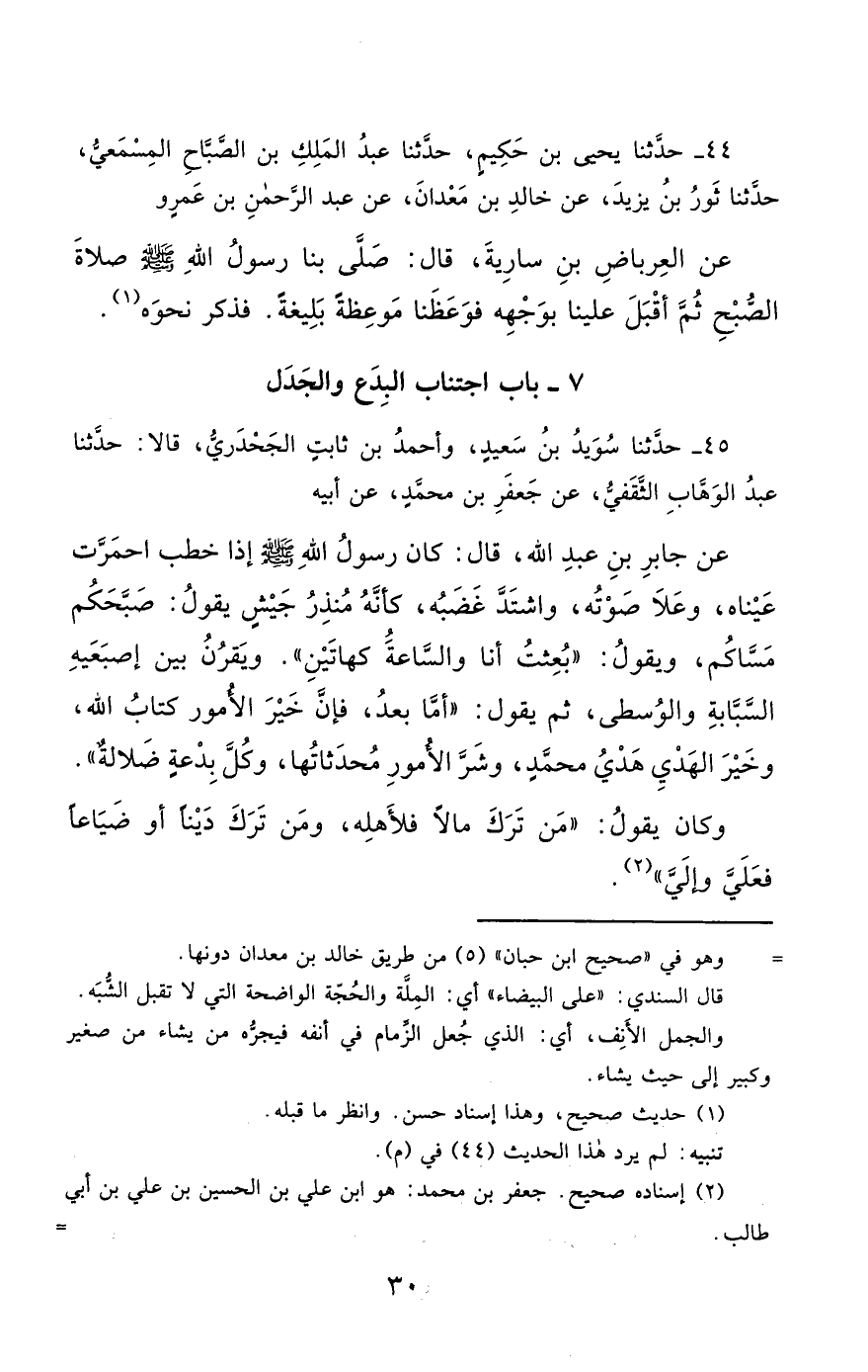 45- حَدَّثَنَا سُوَيْدُ بْنُ سَعِيدٍ ، وَأَحْمَدُ بْنُ ثَابِتٍ الْجَحْدَرِيُّ ، قَالاَ : حَدَّثَنَا عَبْدُ الْوَهَّابِ الثَّقَفِيُّ ، عَنْ جَعْفَرِ بْنِ مُحَمَّدٍ ، عَنْ أَبِيهِ ، عَنْ جَابِرِ بْنِ عَبْدِ اللهِ ، قَالَ : كَانَ رَسُولُ اللهِ صَلَّى الله عَليْهِ وسَلَّمَ إِذَا خَطَبَ احْمَرَّتْ عَيْنَاهُ ، وَعَلاَ صَوْتُهُ ، وَاشْتَدَّ غَضَبُهُ ، كَأَنَّهُ مُنْذِرُ جَيْشٍ , يَقُولُ : صَبَّحَكُمْ مَسَّاكُمْ , وَيَقُولُ : بُعِثْتُ أَنَا وَالسَّاعَةَ كَهَاتَيْنِ ، وَيَقْرِنُ بَيْنَ إِصْبَعَيْهِ السَّبَّابَةِ وَالْوُسْطَى , ثُمَّ يَقُولُ : أَمَّا بَعْدُ ، فَإِنَّ خَيْرَ الأُمُورِ كِتَابُ اللهِ ، وَخَيْرَ الْهَدْيِ هَدْيُ مُحَمَّدٍ ، وَشَرَّ الأُمُورِ مُحْدَثَاتُهَا ، وَكُلَّ بِدْعَةٍ ضَلاَلَةٌ.