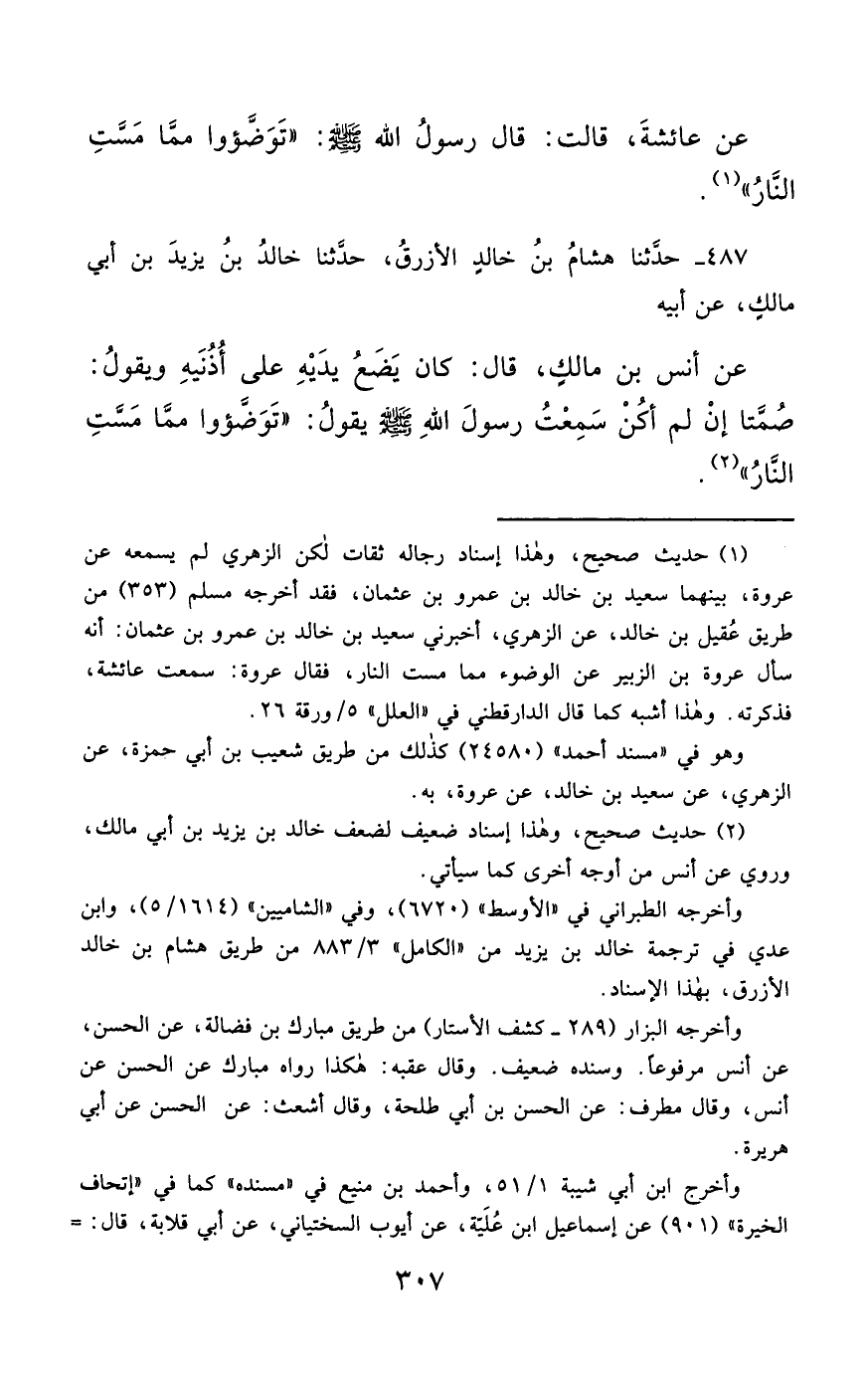 487- حَدَّثَنَا هِشَامُ بْنُ خَالِدٍ الأَزْرَقُ ، حَدَّثَنَا خَالِدُ بْنُ يَزِيدَ بْنِ أَبِي مَالِكٍ ، عَنْ أَبِيهِ ، عَنْ أَنَسِ بْنِ مَالِكٍ , قَالَ : كَانَ يَضَعُ يَدَيْهِ عَلَى أُذُنَيْهِ وَيَقُولُ : صُمَّتَا ، إِنْ لَمْ أَكُنْ سَمِعْتُ رَسُولَ اللهِ صَلَّى الله عَليْهِ وسَلَّمَ يَقُولُ : تَوَضَّؤُوا مِمَّا مَسَّتِ النَّارُ.
